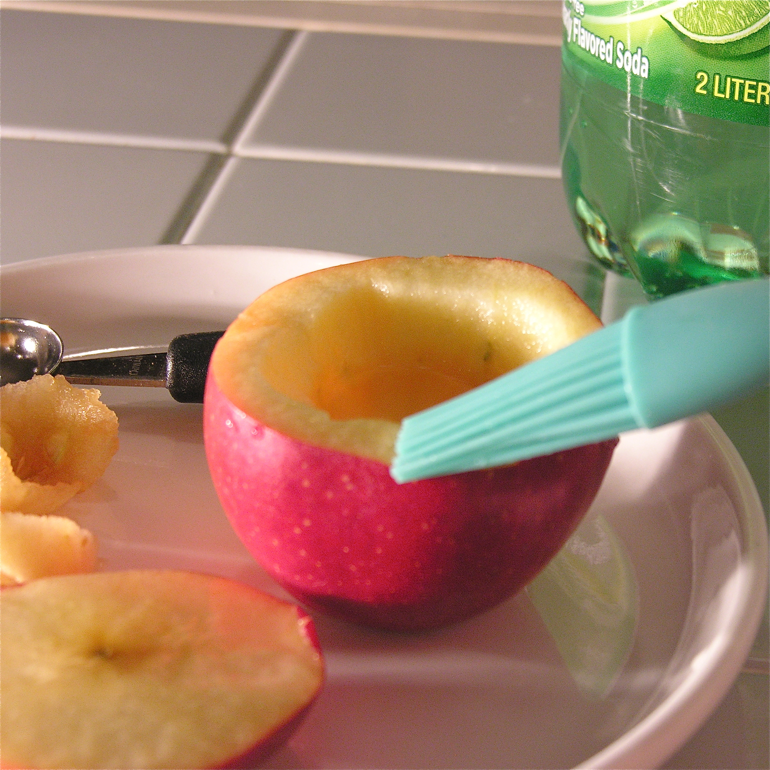 • Fill apple “cup” with 7-up and use a kitchen brush to coat edges and top  with 7-up (this will prevent browning).