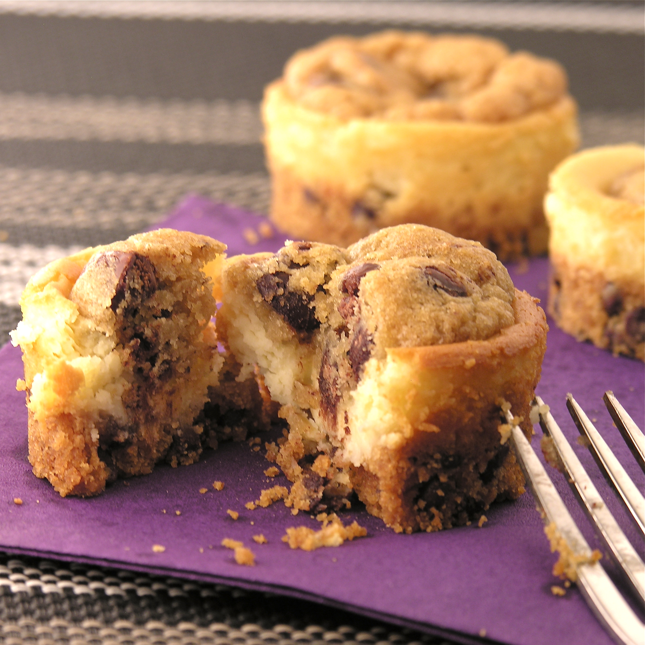 These yummy little cheesecakes have chocolate chips in the crust and adorable little chocolate chip cookies baked right on the top. A perfect mini party dessert!!