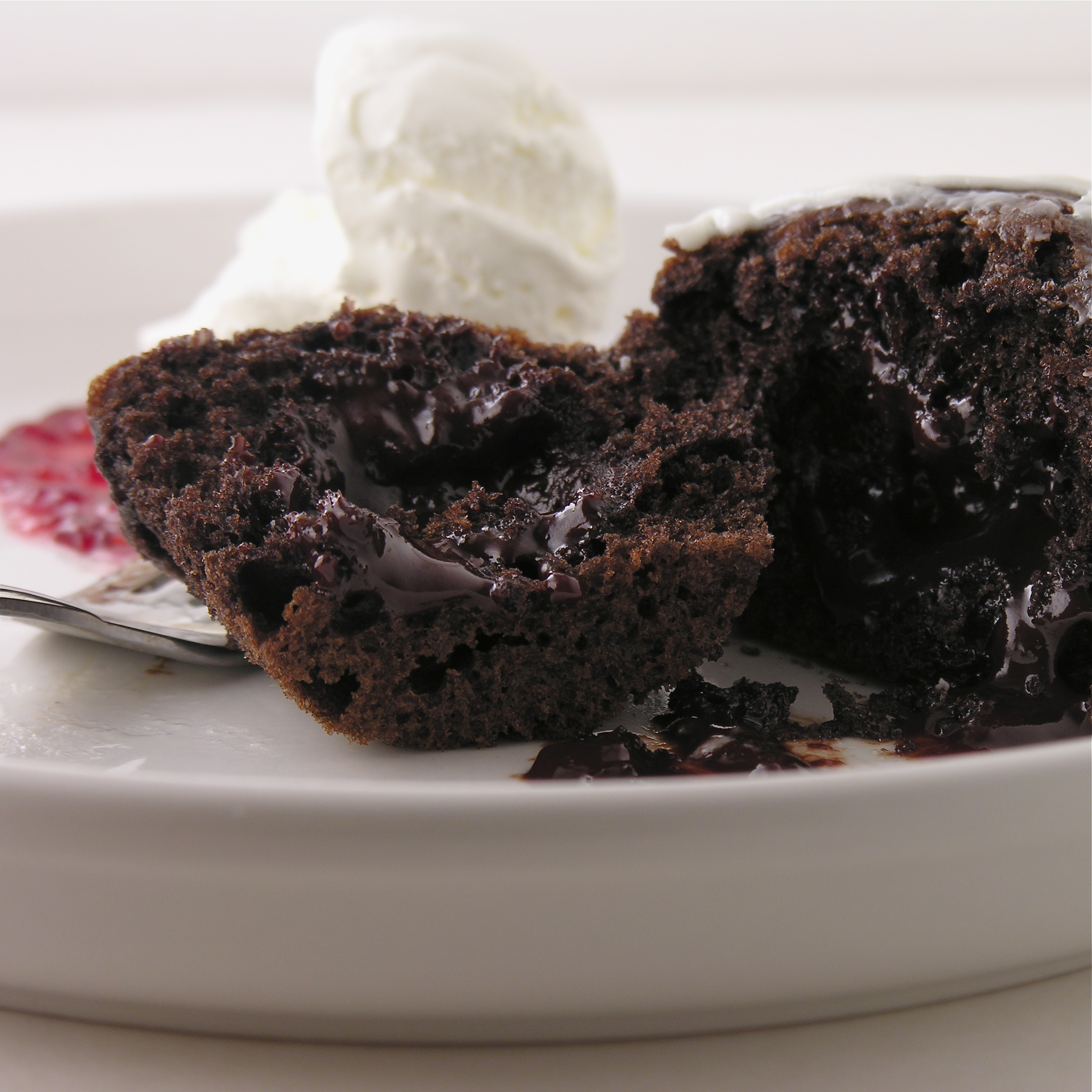My thoughts: I’ve had many a molten lava cake and cupcake before, but usually they fall apart right out of the pan.  These cupcakes hold together beautifully and don’t leak all that warm fudge out until they are cut into.  They are perfect re-heated and sooooo yummy with a little ice cream and raspberry sauce.  A perfect treat for a chilly fall day!!  Enjoy!!  ~r