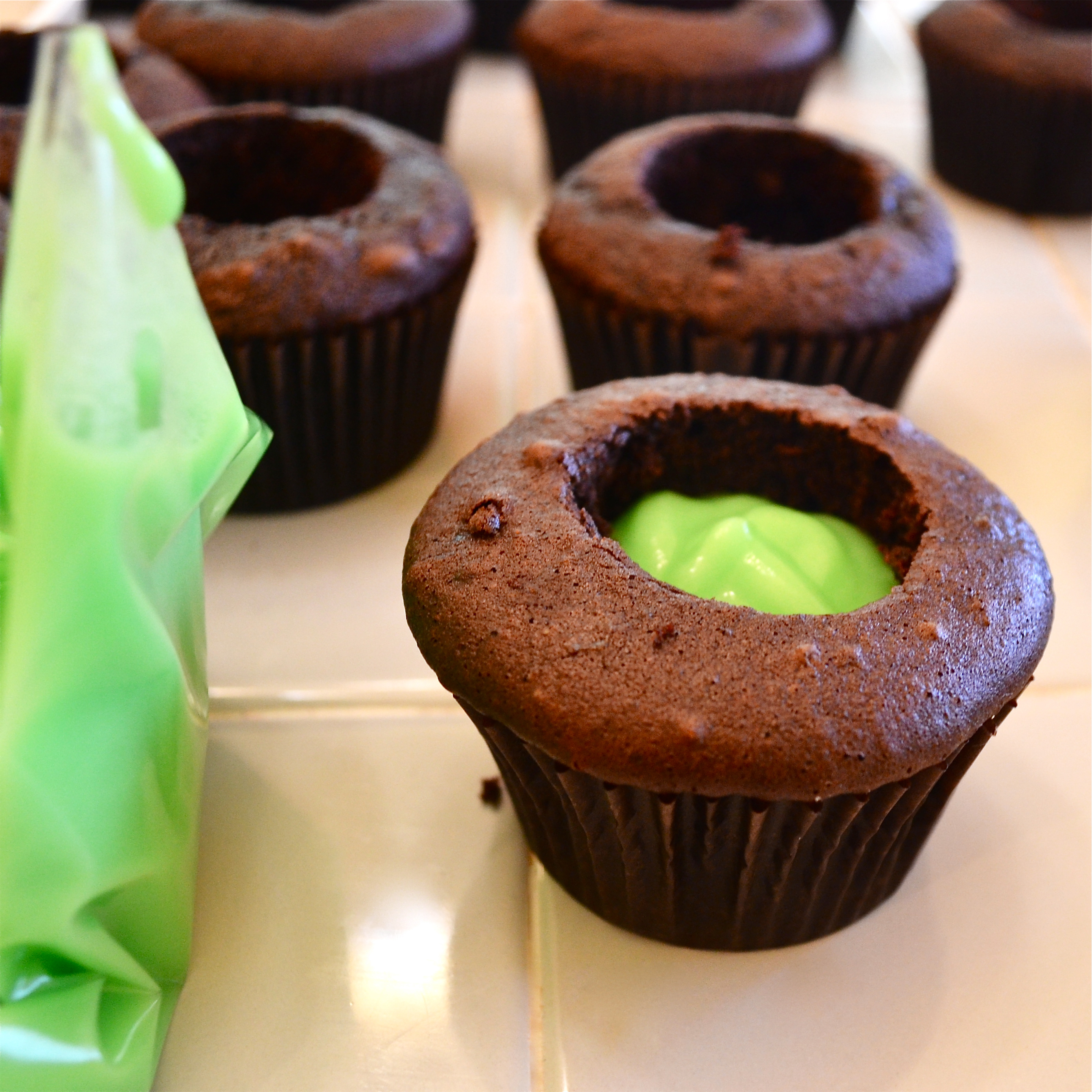 • Carefully clip a corner of your green slime (pudding) bag and fill each cupcake cavity about half full of “slime”.