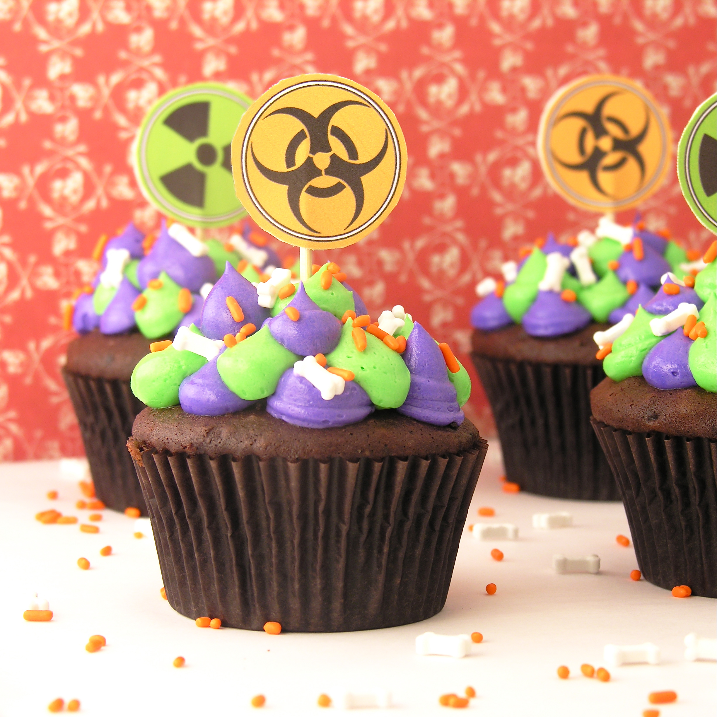 I also created some free printable “radioactive” cupcake toppers for you.  Just click here for the link, print 2 pages on card stock, cut them out and use double-sided tape to stick them back-to-back over a toothpick.    Easy-peasy and a perfect finish on these!  Aren’t they fun?!???