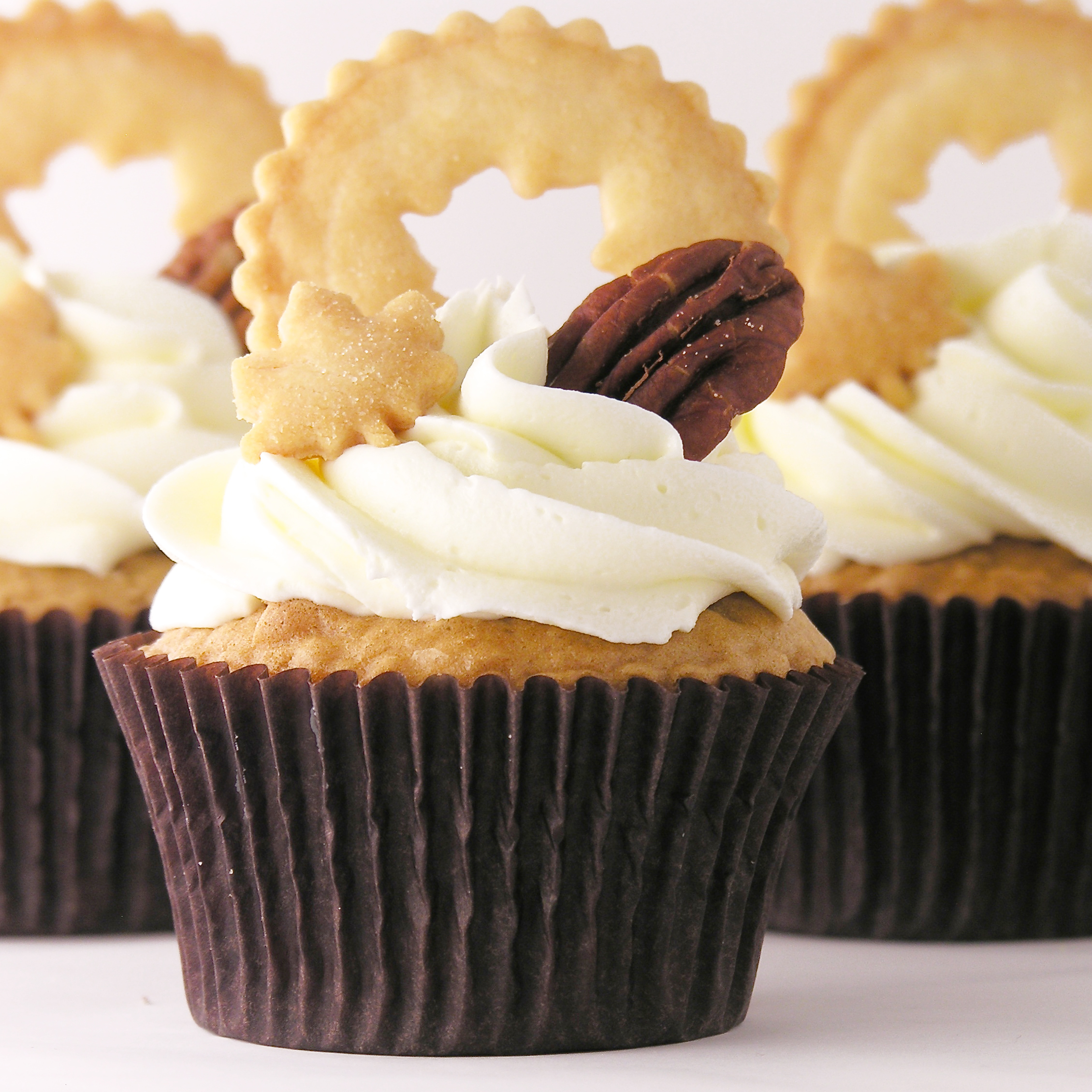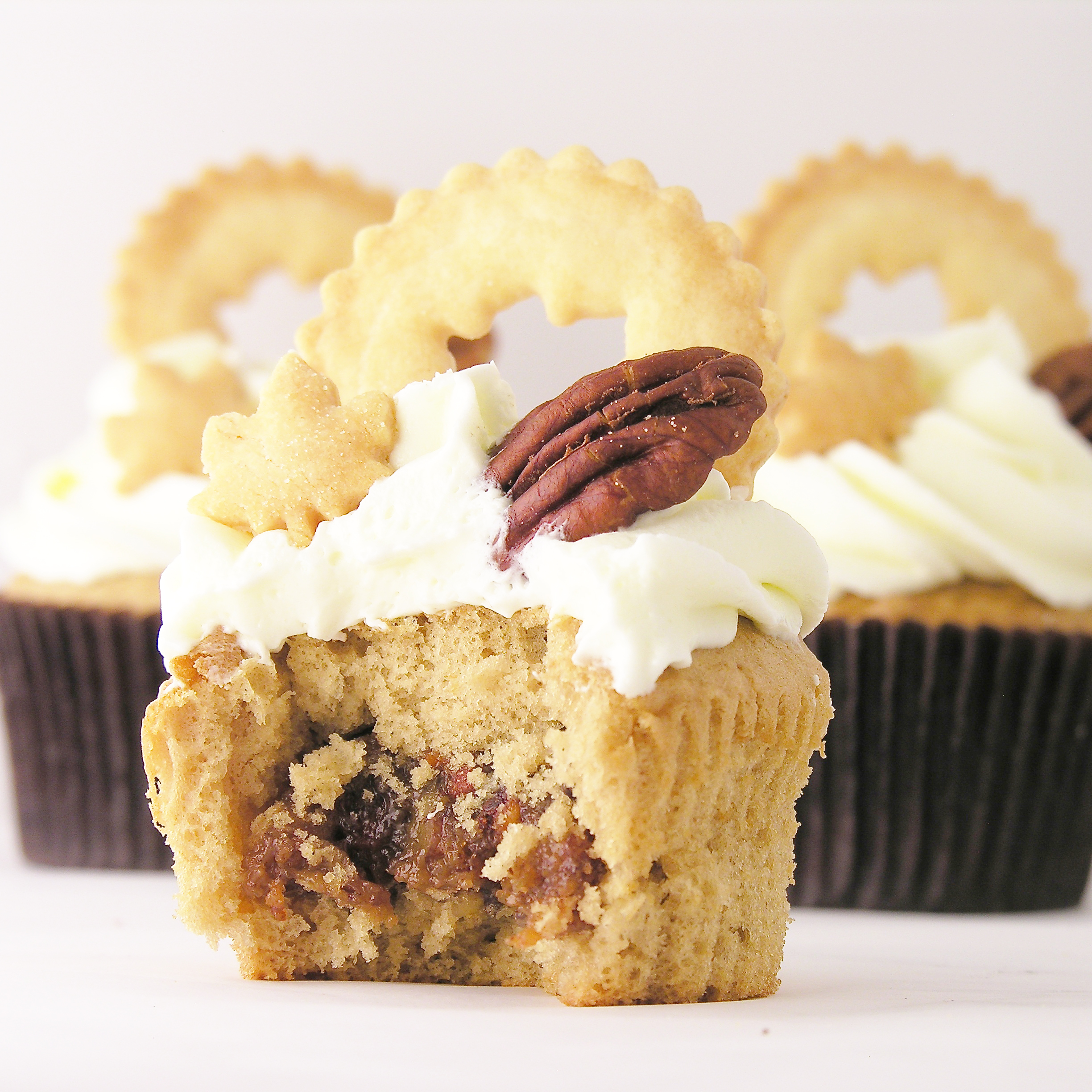 If you like pecan pie, you will go nuts over these cupcakes! With caramel pecan pie filling in the middle and crisp pie crust decorating the top, these say Happy Thanksgiving in a fun new way!