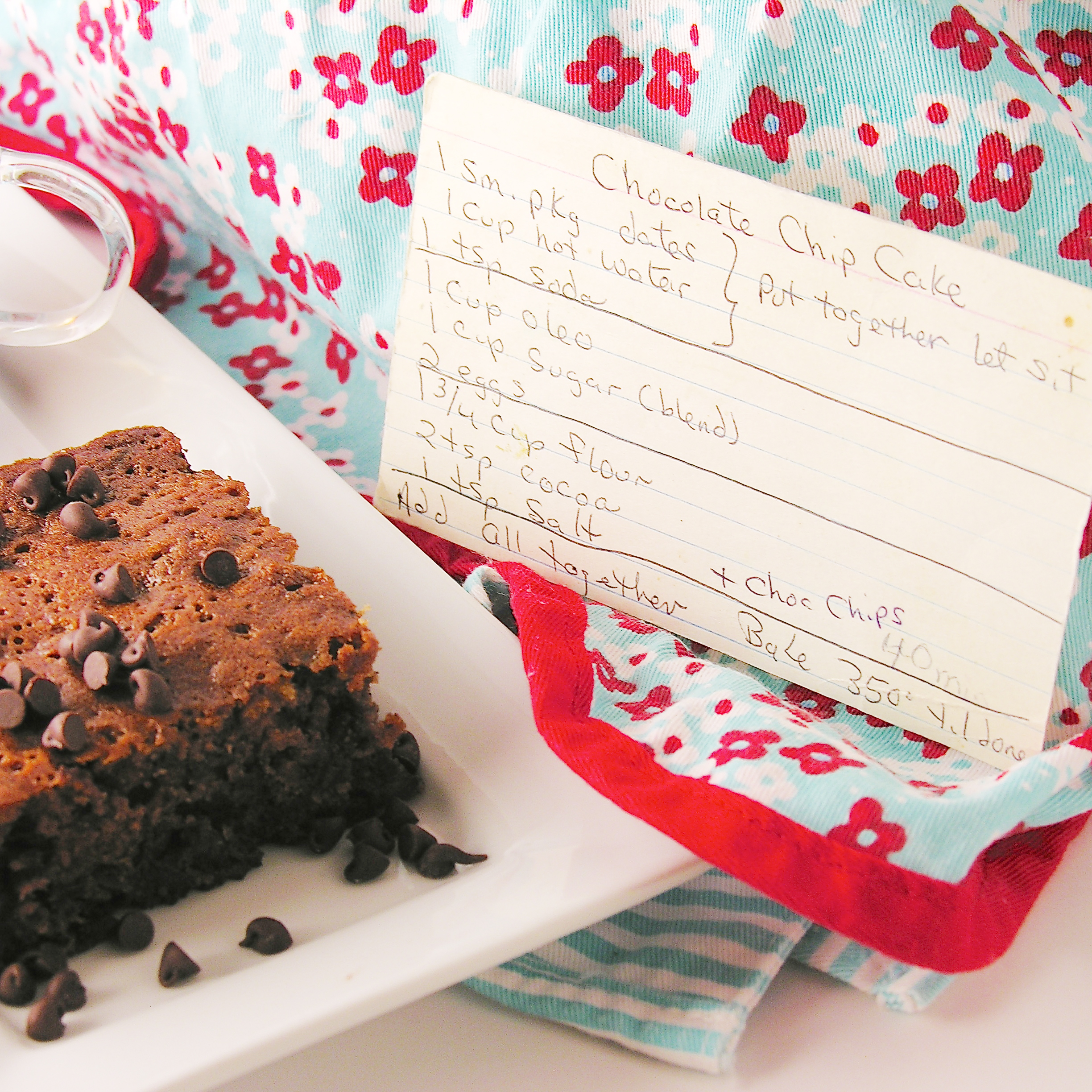Chocolate Chip CakeOur family recipe made me smile. Oleo (??) is margarine… and bake “til done” is nice too. Gotta love the way grandmas bake! This is my mom’s recipe card and she graciously added  “40 minutes” at some point in the history of making this cake for us.