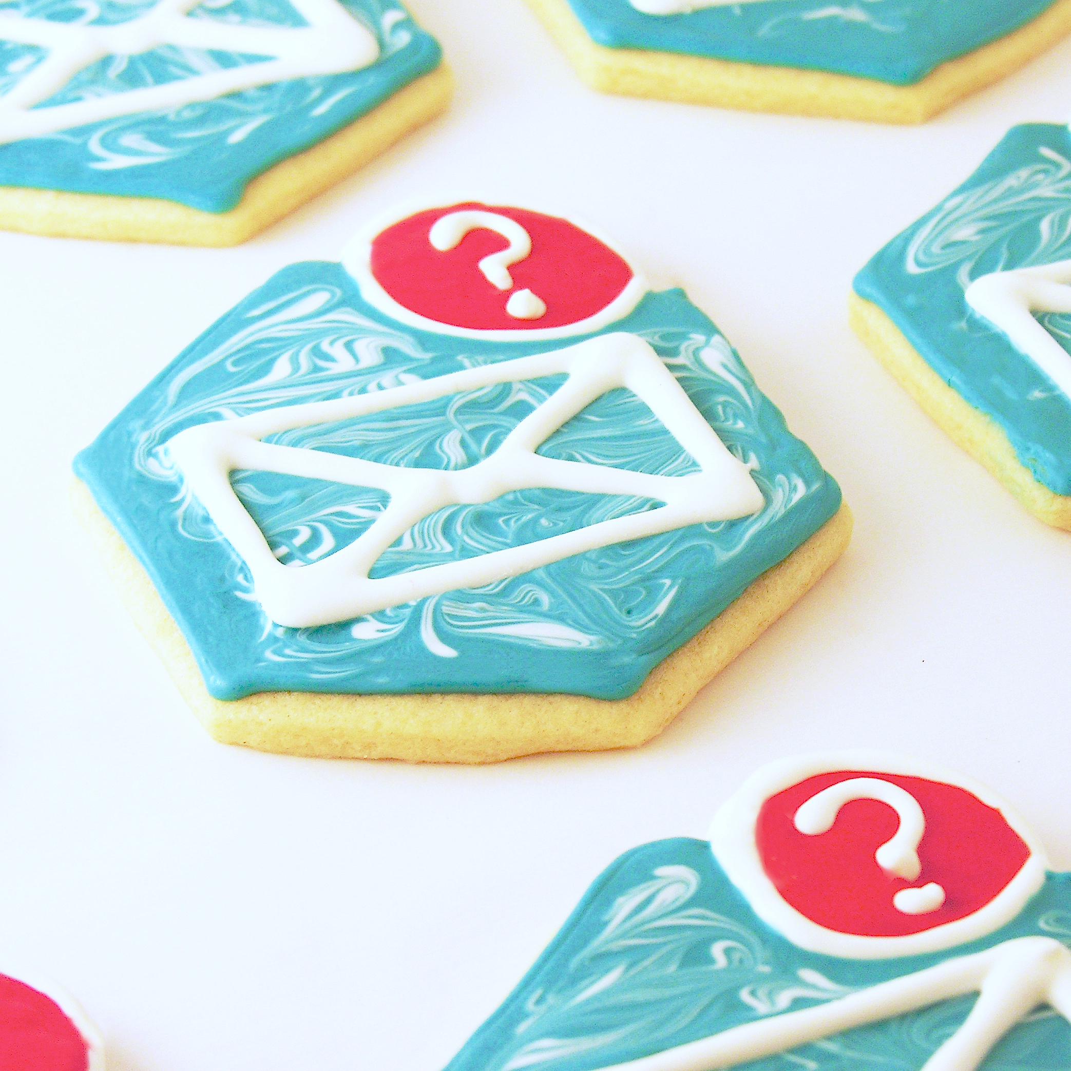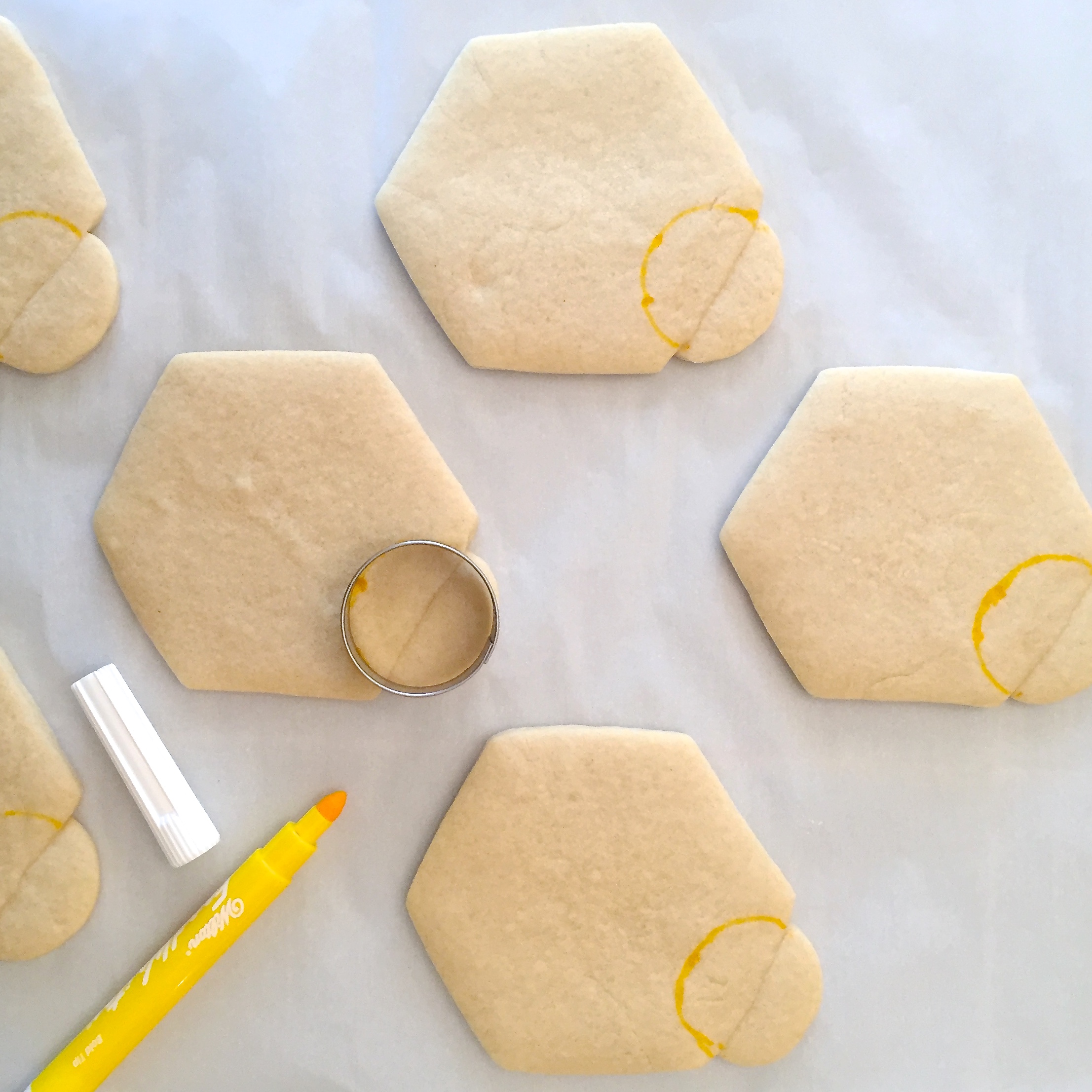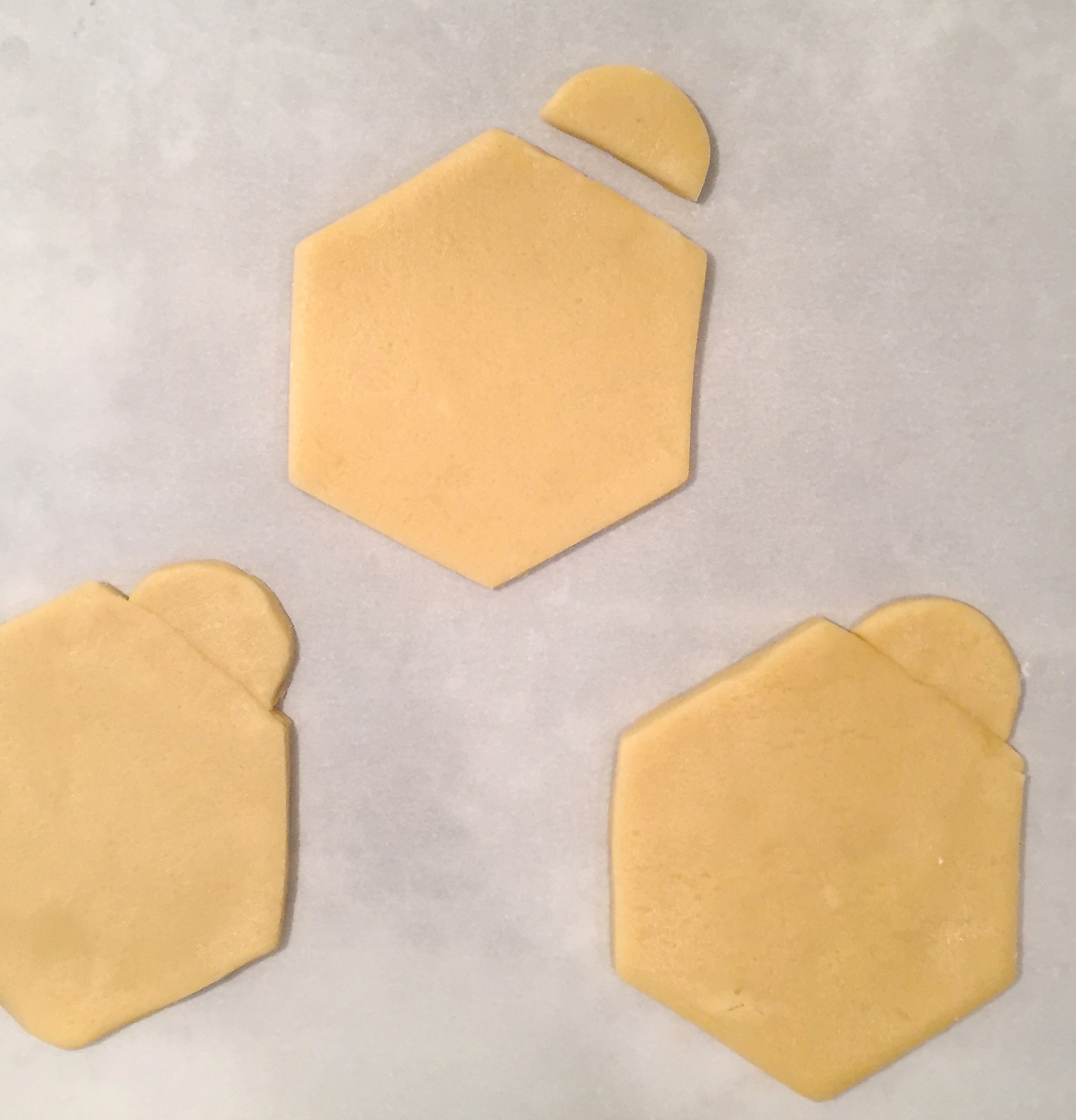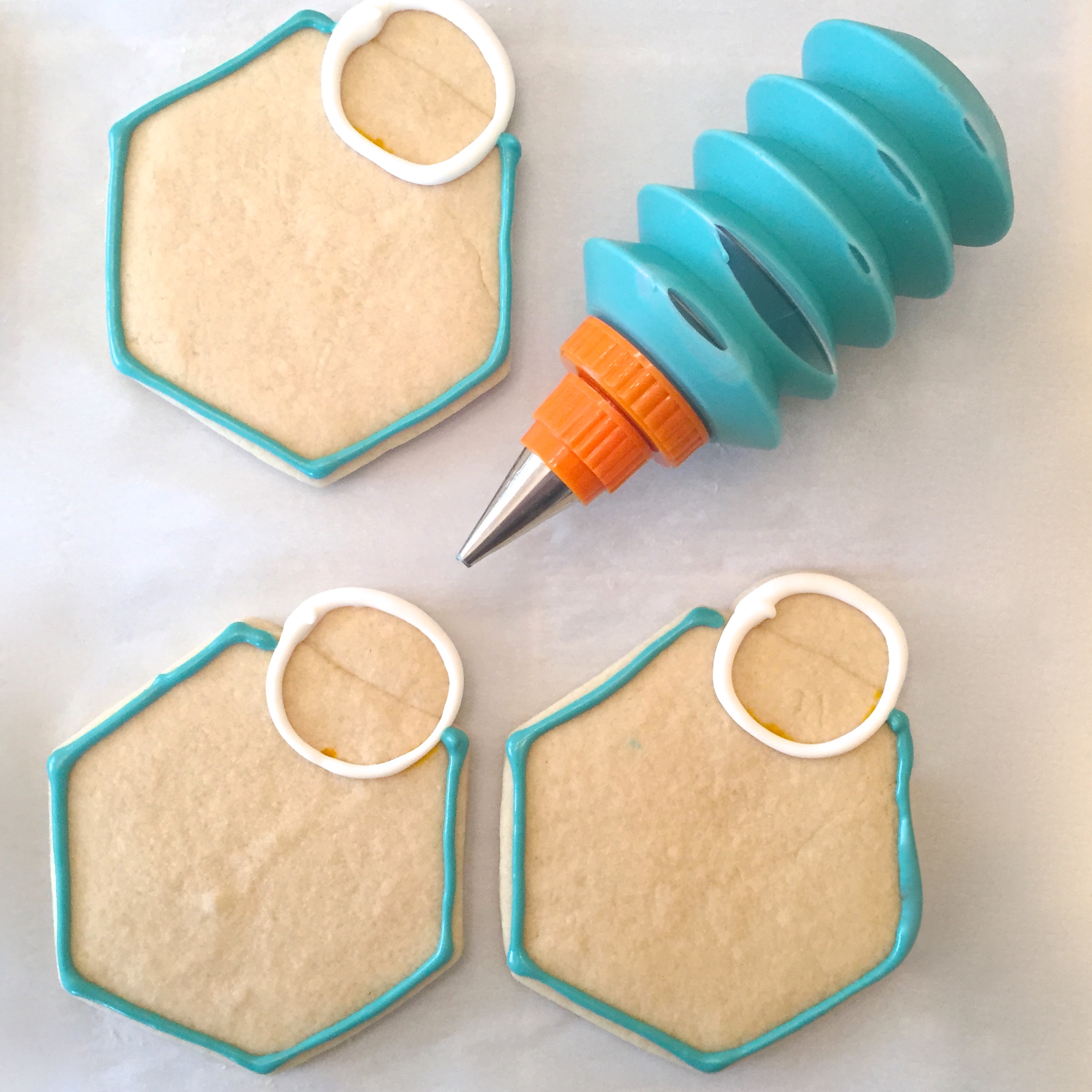 Me neither. When I was challenged to re-create this design in cookie form I knew I could get a hexagon cookie cutter- but how to add that cute little circle at the top? Then, how to decorate them without using Royal Icing? I’m not a fan of all the waiting for it to harden between colors.