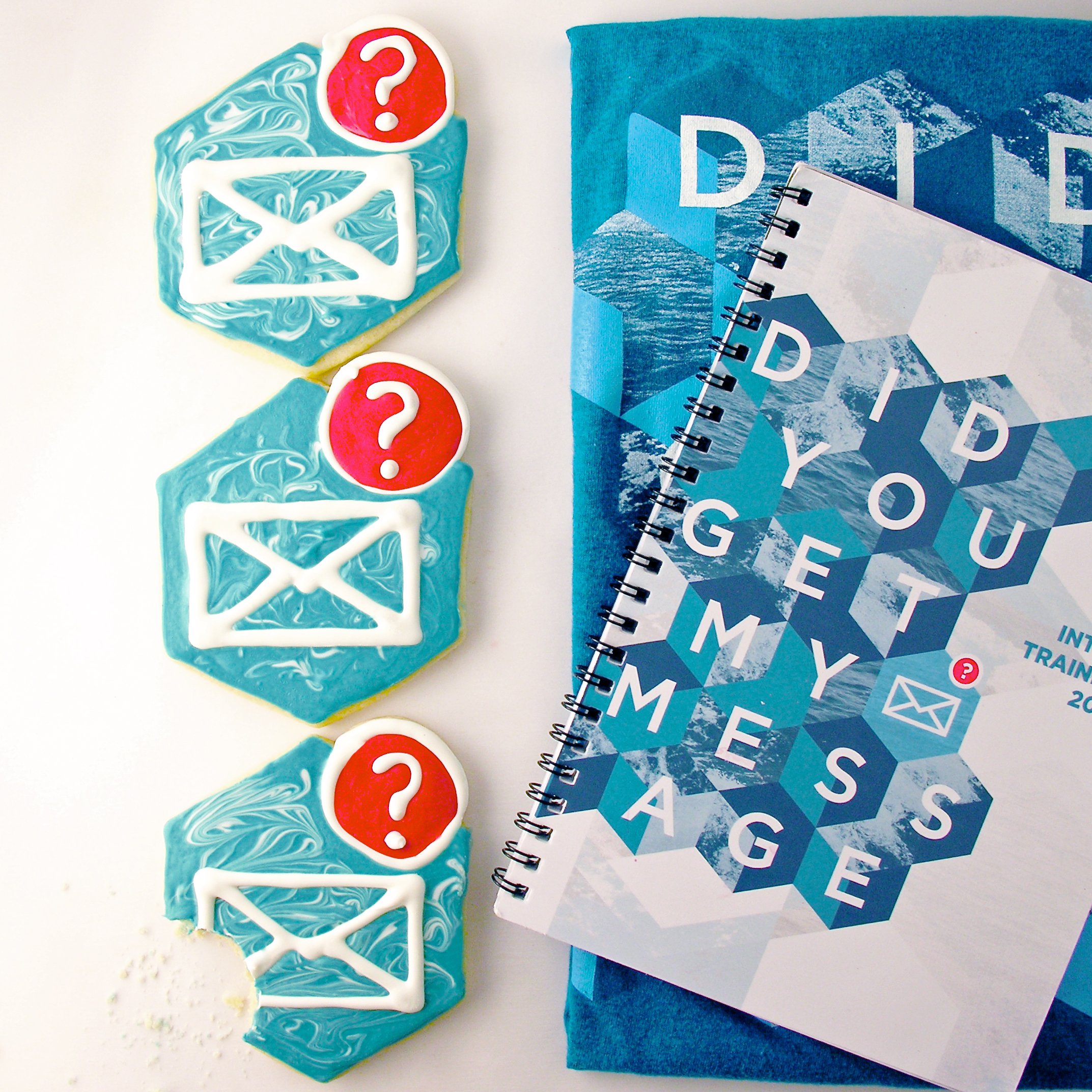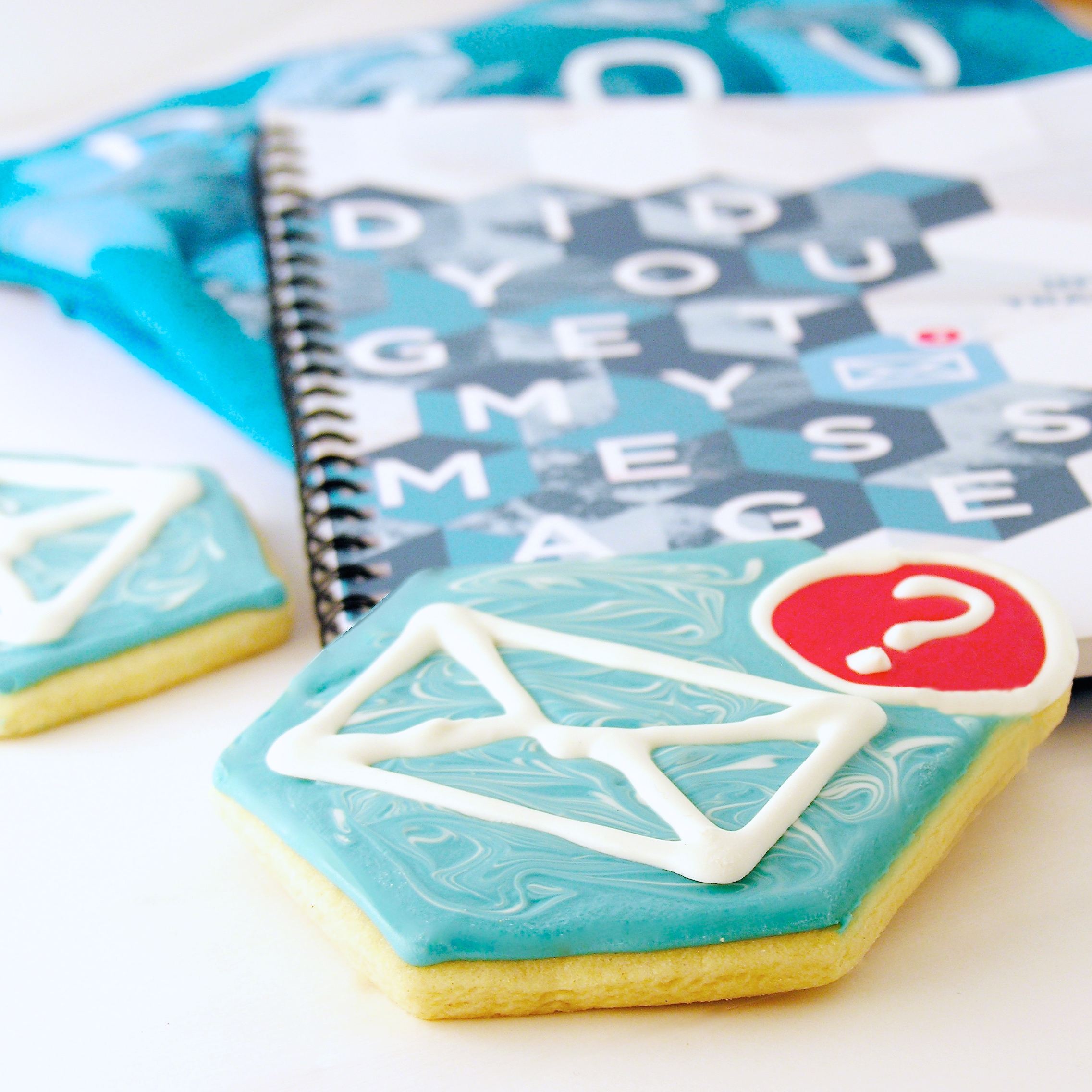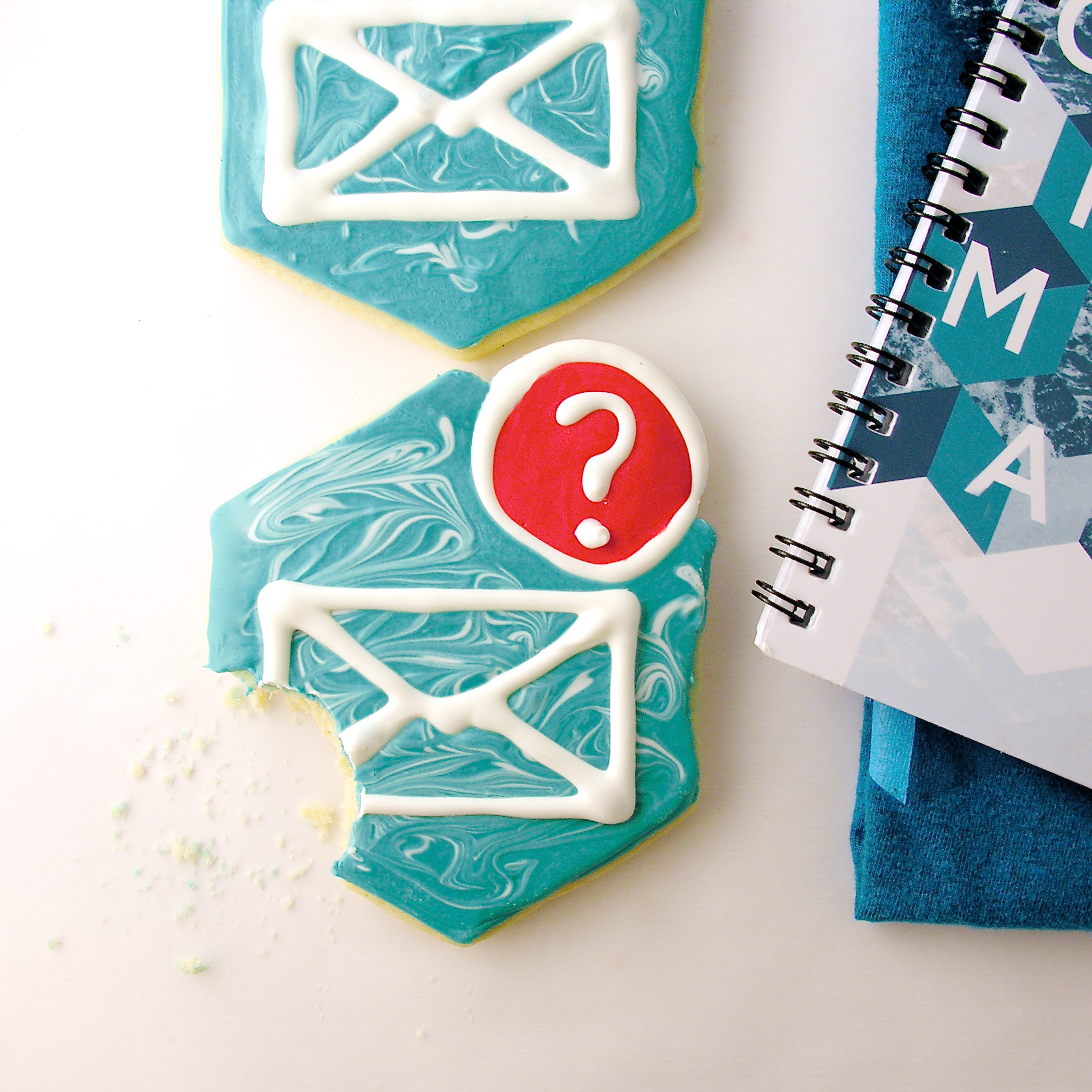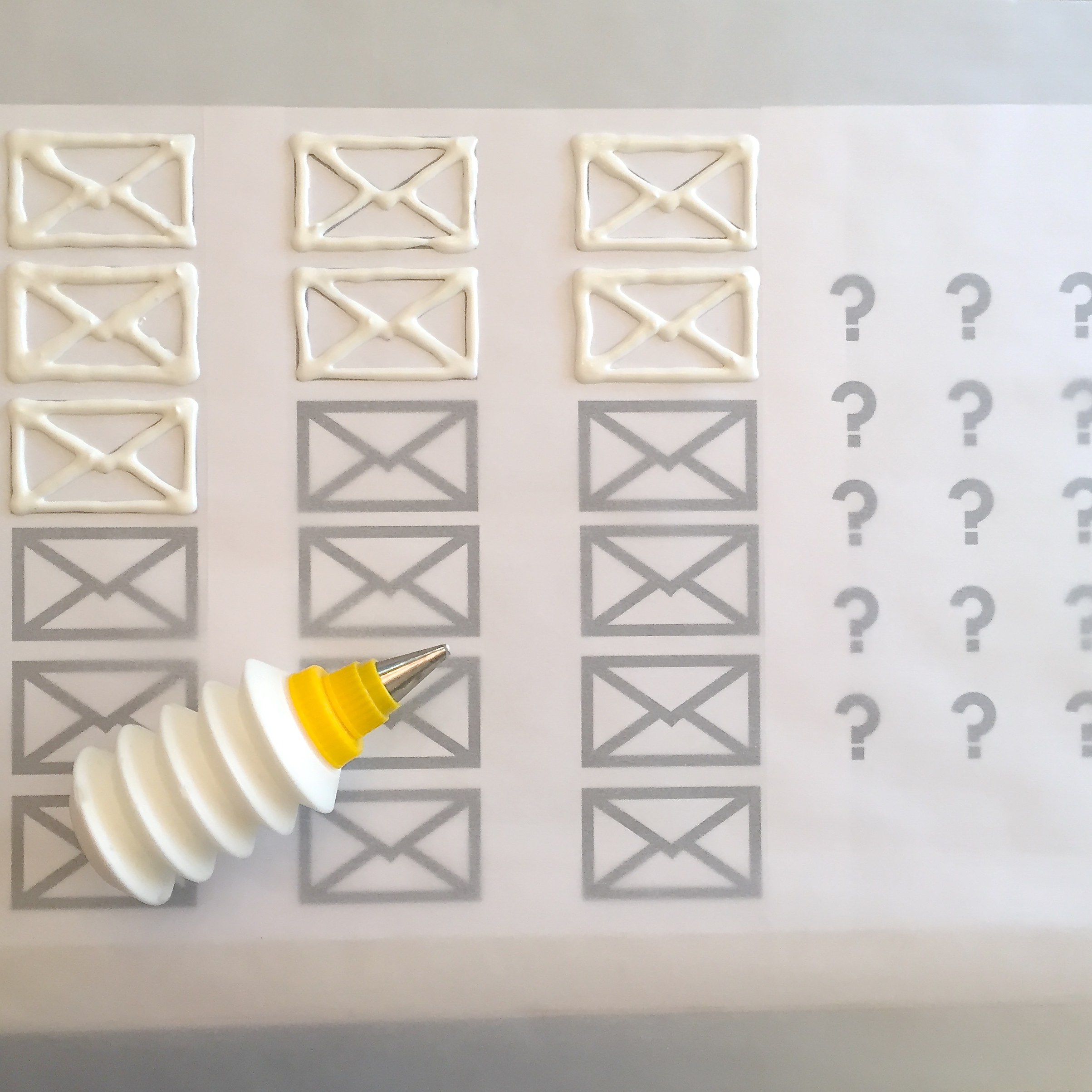 • I needed 2 items drawn on top of each cookie- an envelope and an question mark. I drew the envelopes out on my computer, found a good bold font for the question marks, and printed several sheets of these. I taped them under parchment paper and used melted white candy melts to trace them. To melt candy melts, you heat them in the microwave in 30 second increments, stirring until smooth.