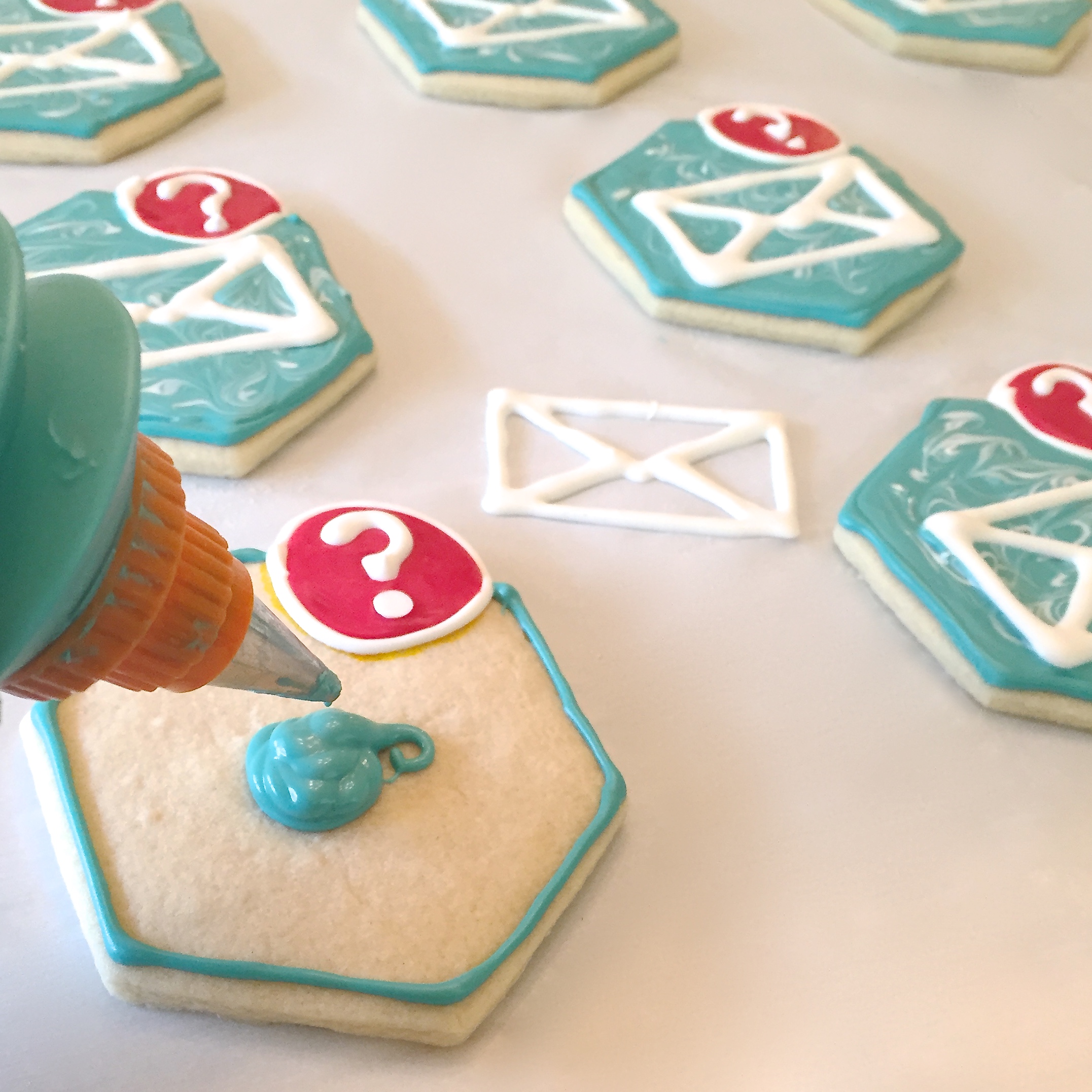 • Finally, red candy melts are piped into the circle, filling it completely. I tapped the cookie gently on the table to get rid of bubbles before gently setting a question mark in the center. This step further cements those cookie pieces together.