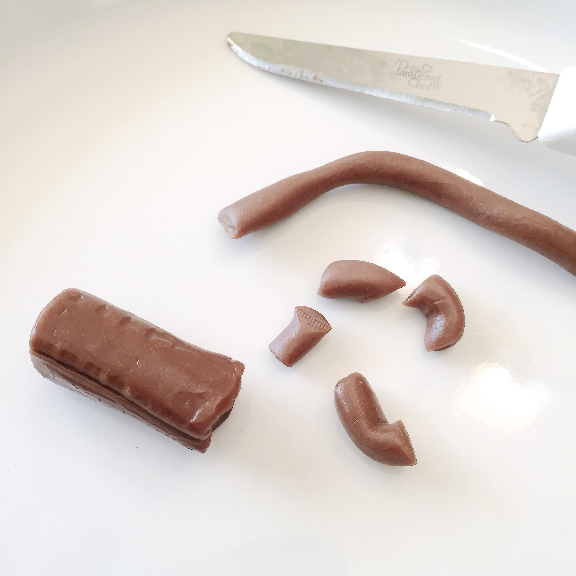 - Make stems by rolling tootsie rolls out and cutting into short pieces.
