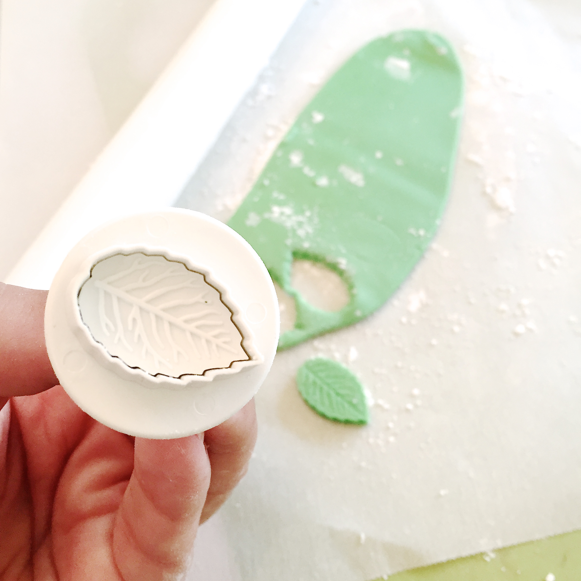 - Take colored fondant and roll it out. Use leaf-shaped cutter