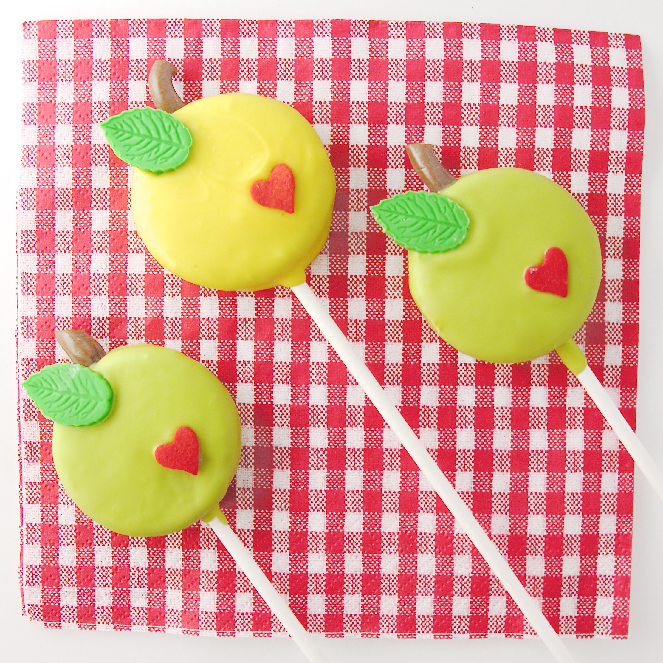 I hate to even say the words….but fall is coming. I love summer so much, that when I start to see school busses out on the roads I just cringe. Fall has some pretty fun foods though….! One of our family-favorites is apples. I grew up in Michigan, and we have the best fall apples. I loved trips to the orchard to get cider and doughnuts- and these little Oreo pops are perfect to kick off the fall season.