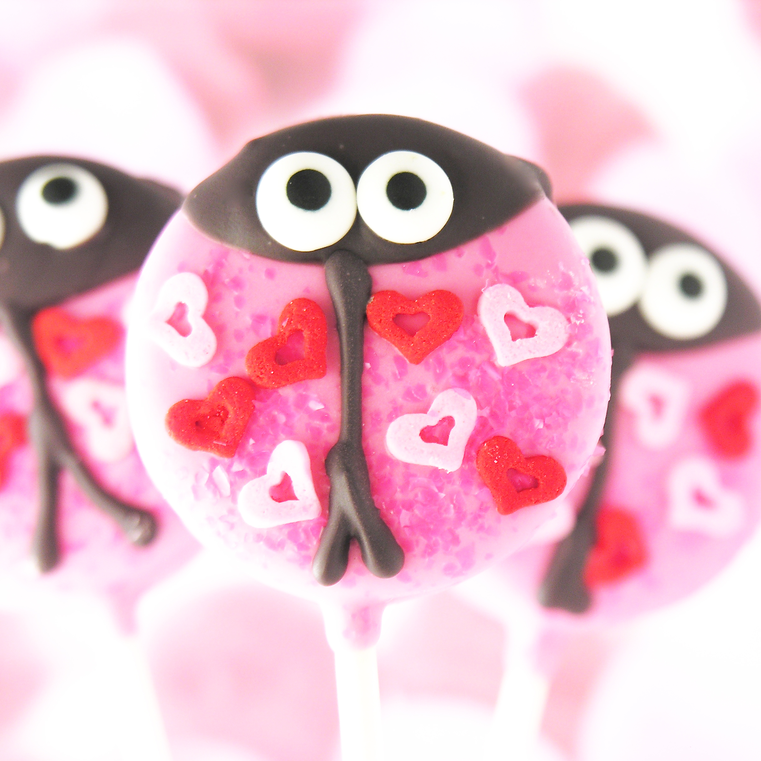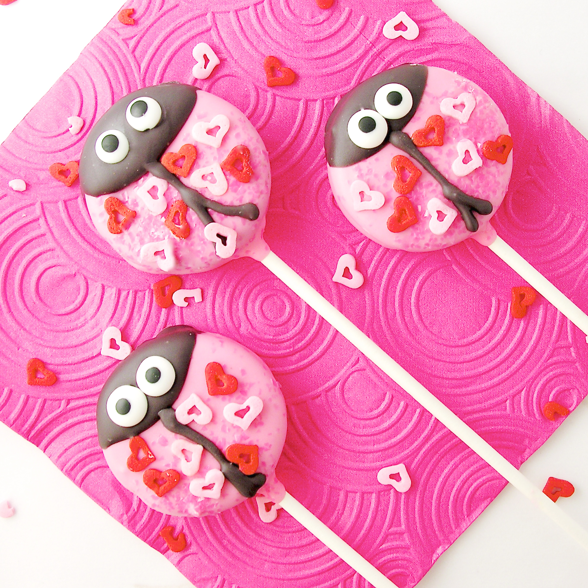 I made Lady Bugs Oreo Pops a couple of years ago, and when I was visiting Florida last month I was subjected to everyone’s horror stories about some awful little bug called a Love Bug. I guess people hate them down south, but when I heard “Love Bug” I immediately pictured these. Sweet little pink bugs with hearts and sprinkles!