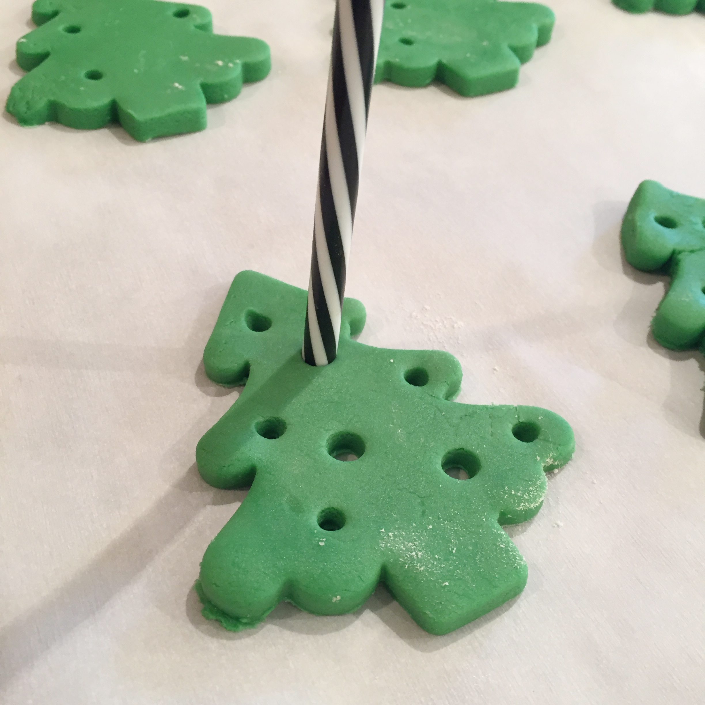 - Press a lollipop stick through a Dots candy until about 1 inch of the stick is out of the other side (see photo below).