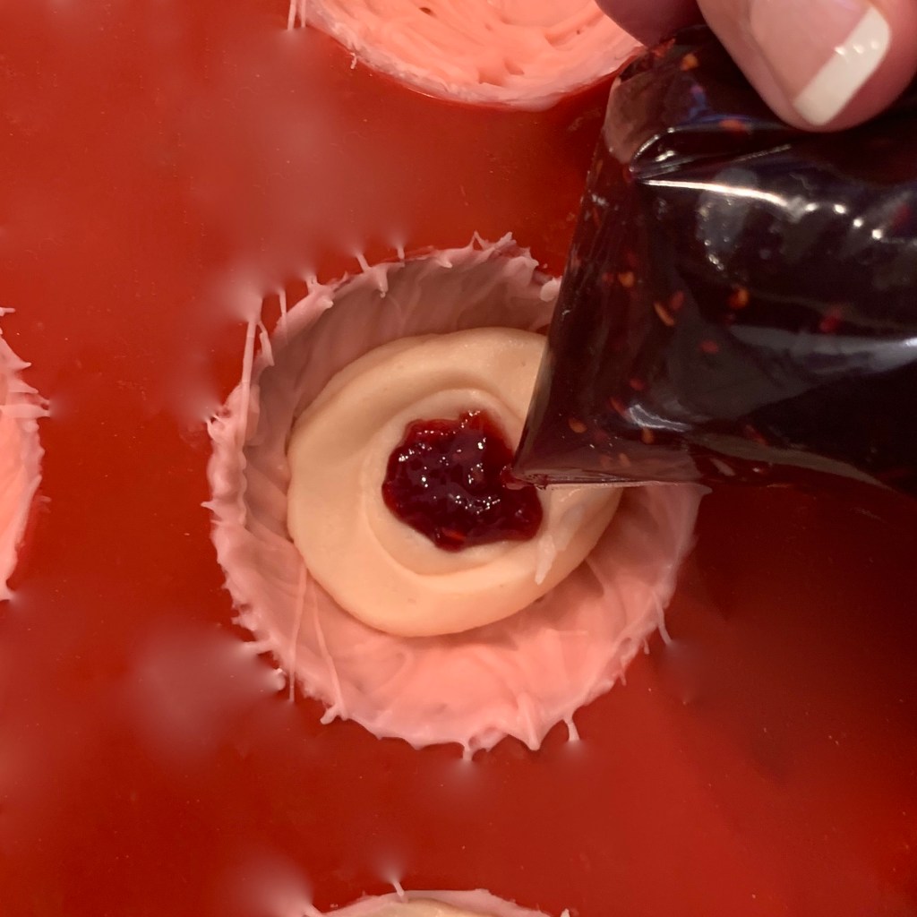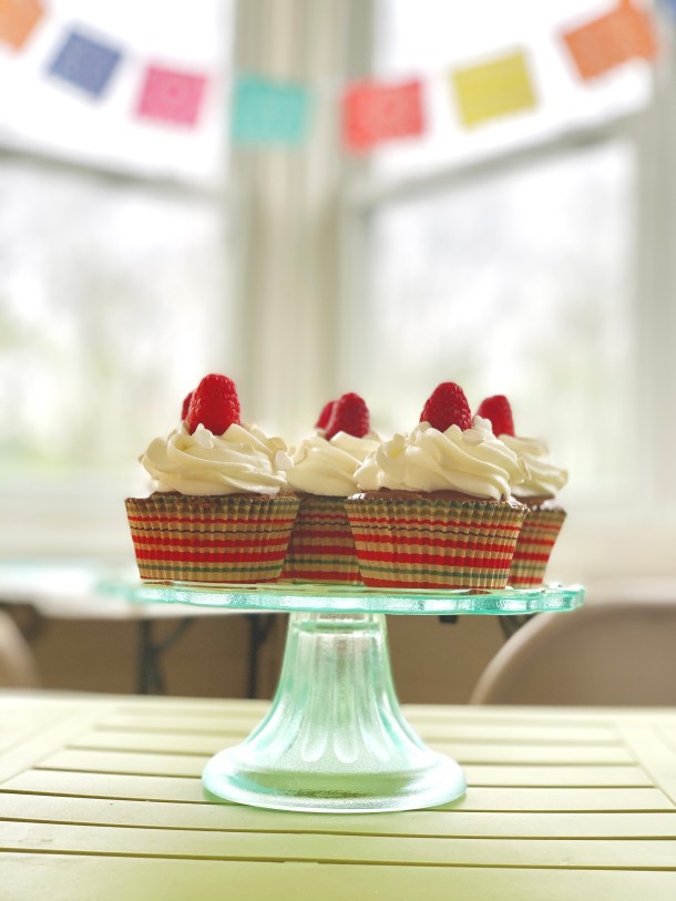 So… here’s a second go-around with these flavors except that this time it is WAY more real-fruity, and a totally different feel than the first time I combined these ingredients in a cupcake! The first time was more flavoring from a passion fruit syrup. This time it’s all fruit! My husband says they are like a fruit-filled doughnut and that the filling is “SO good!” I like the decorations on my first cupcakes better, but had no time to make meringues today. Check it out for inspiration though!