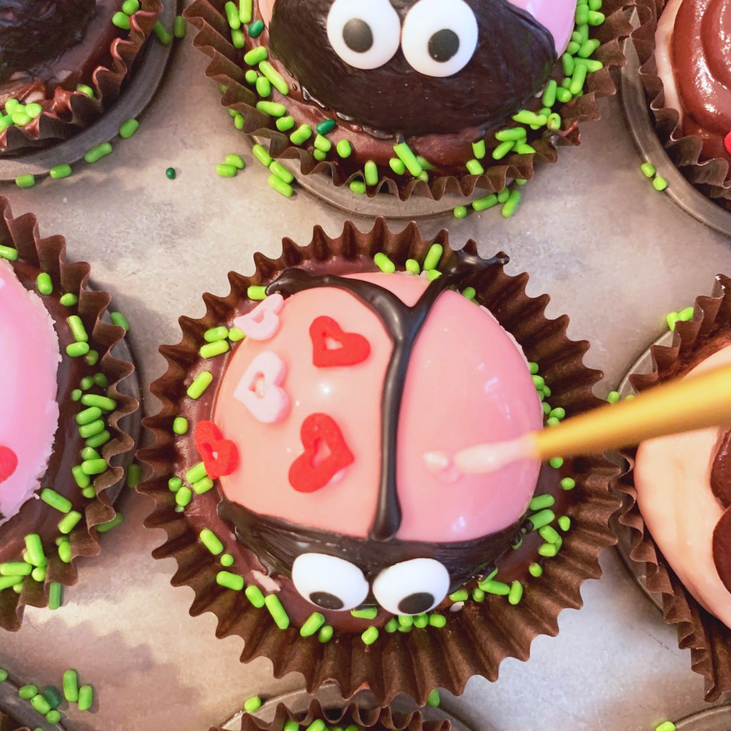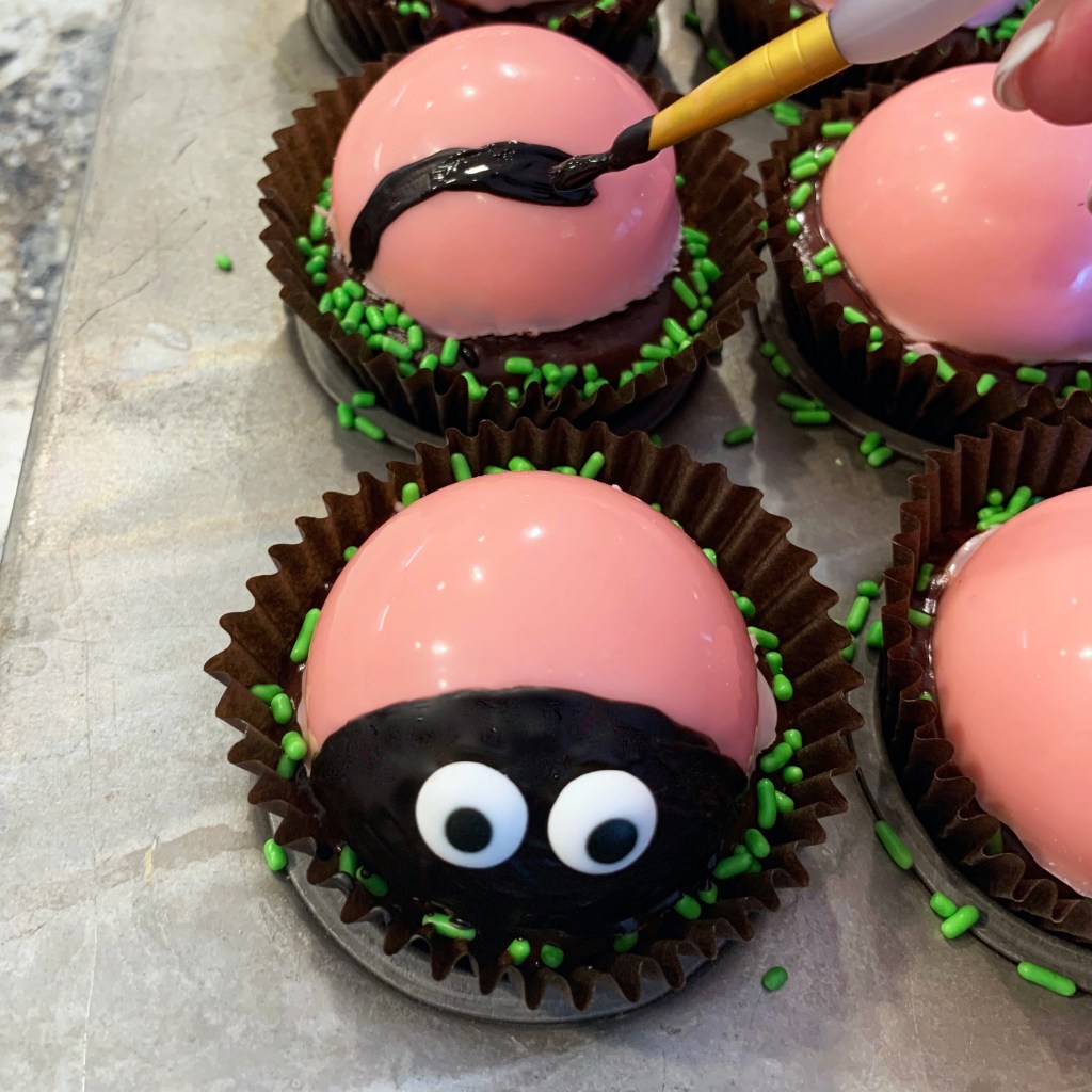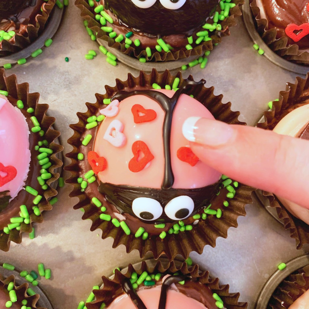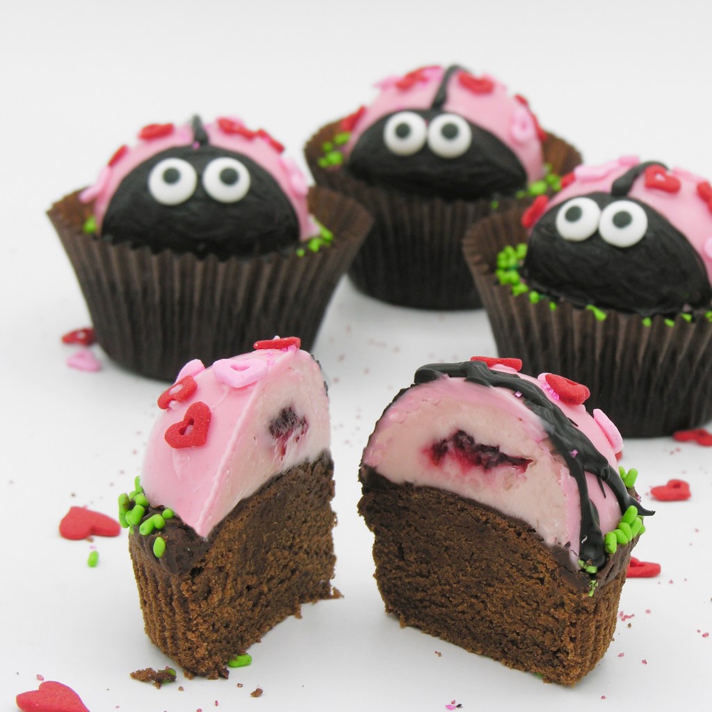 - Hollow out a little core in each cupcake using a knife or a cupcake corer, (affiliate link) and saving the top portion to use as a “lid”.