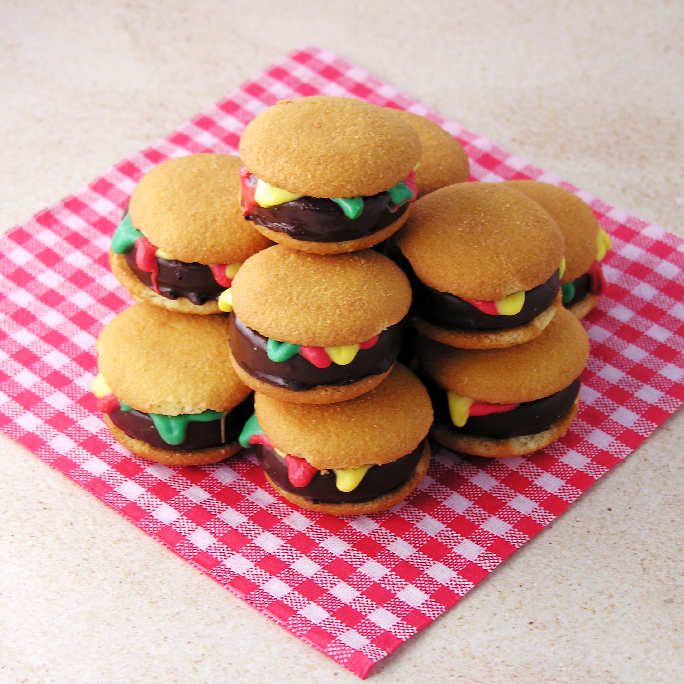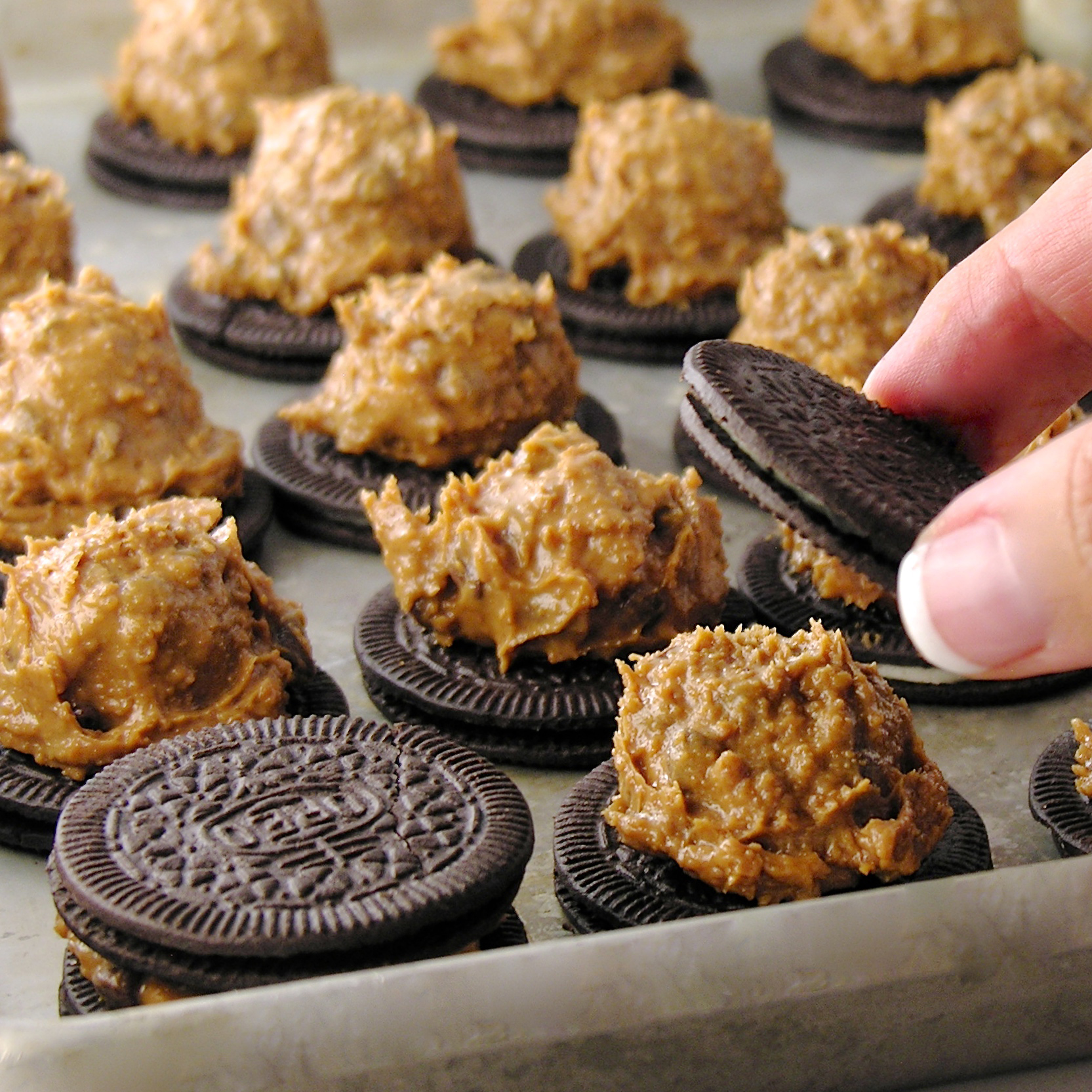 - Using one of the pop sticks, make an indentation in the white filling of each cookie.