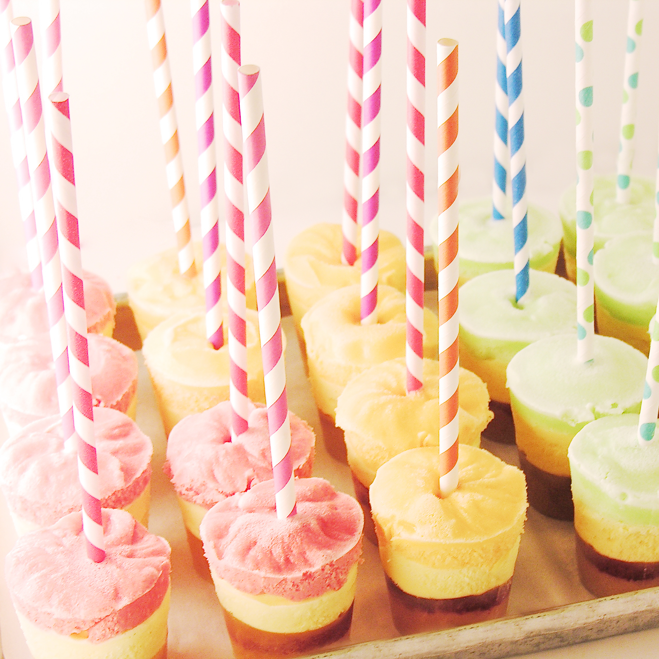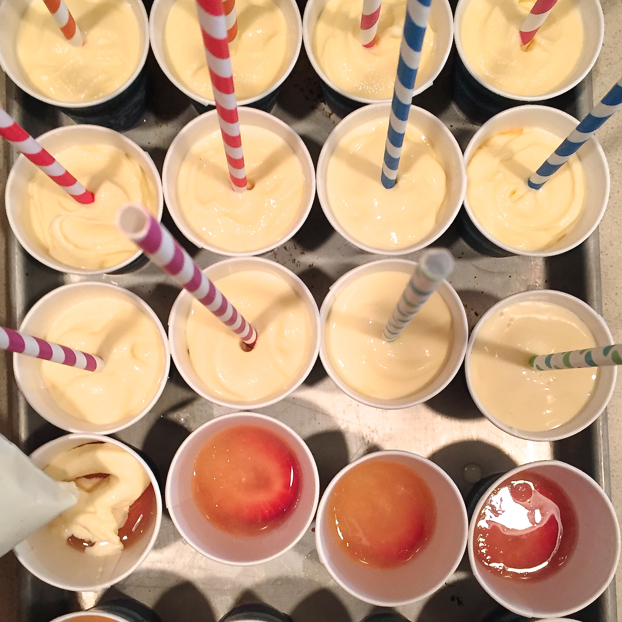 - Add pink food coloring to remaining peppermint milk, and pour a little on top of each pop.
