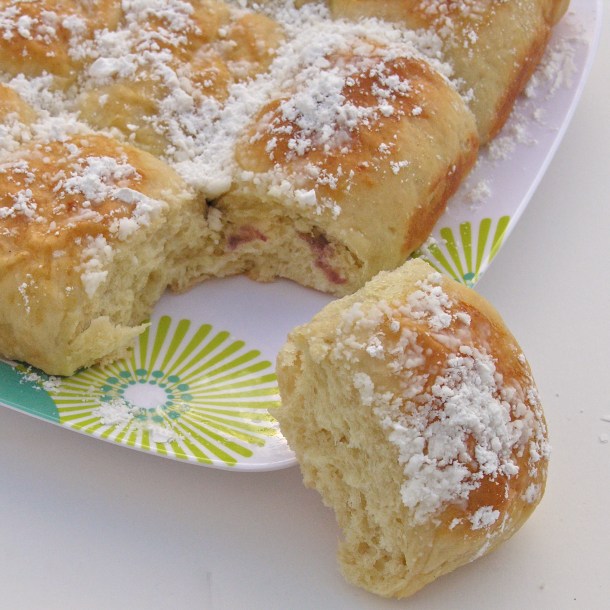 - Set into pan (or on cookie sheet) and brush tops with milk. Sprinkle with sugar (I used cinnamon and sugar).