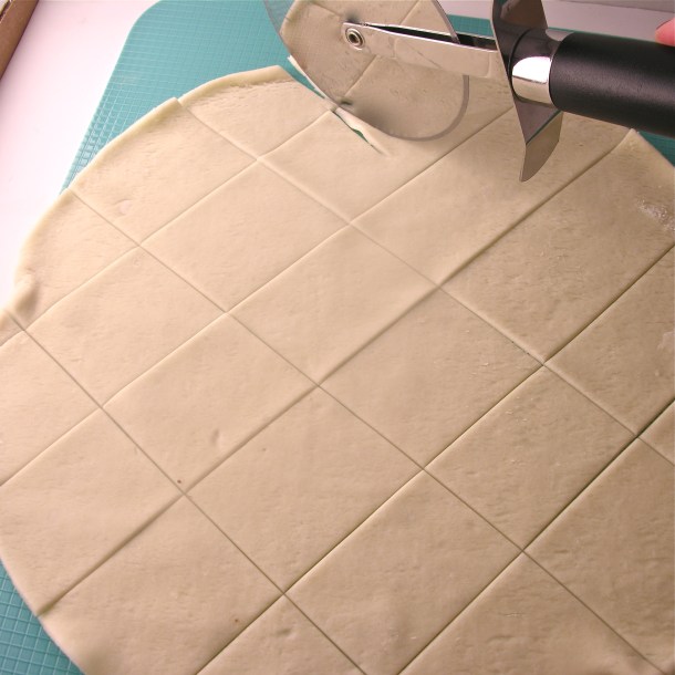 - Press remaining dough into a square on a floured counter and cut into triangles as shown (I used a pizza cutter and a knife- both worked fine).