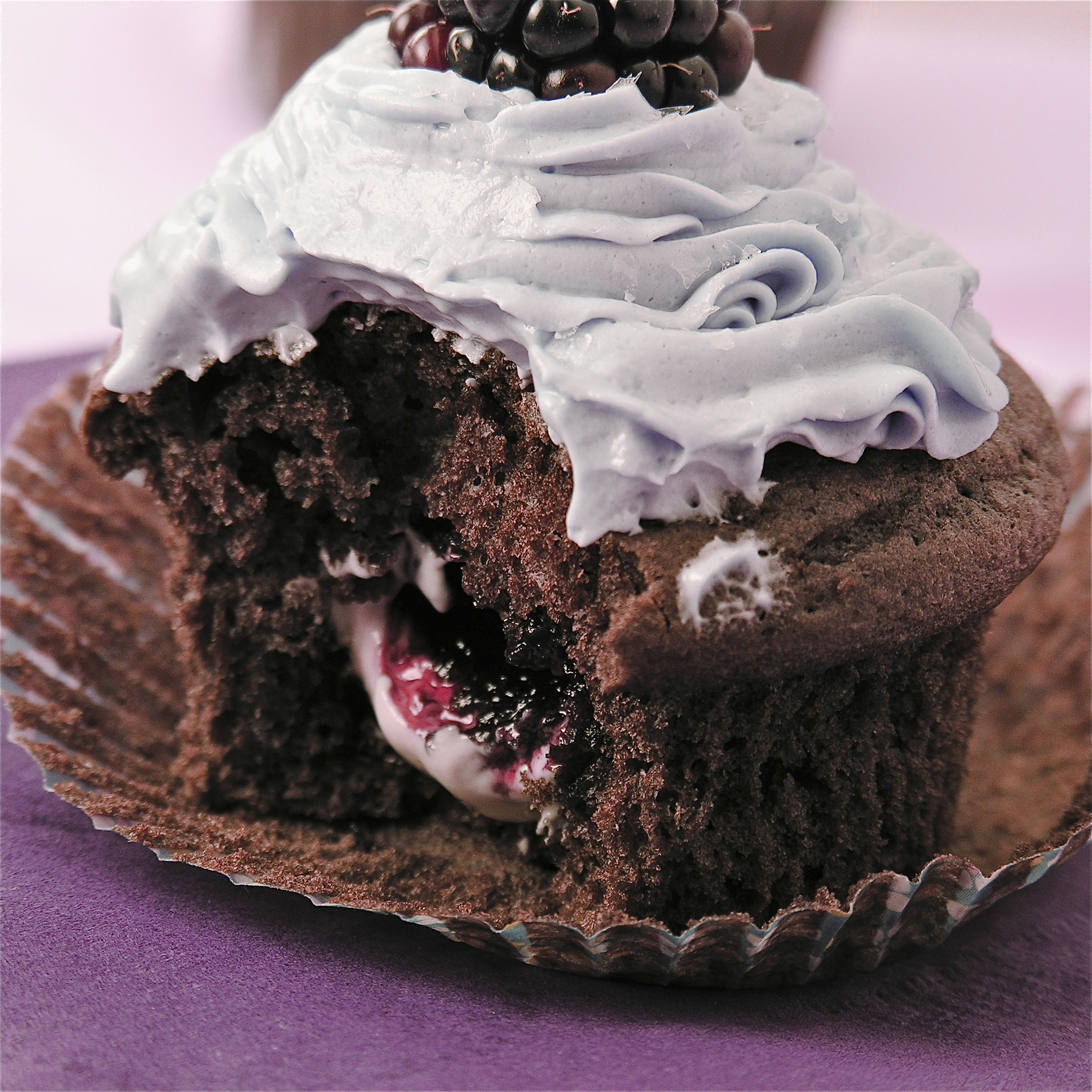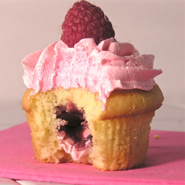 These delicious cupcakes are topped with a dome of raspberry cream and a touch of black raspberry jam- a perfectly pink Valentine’s Day treat!