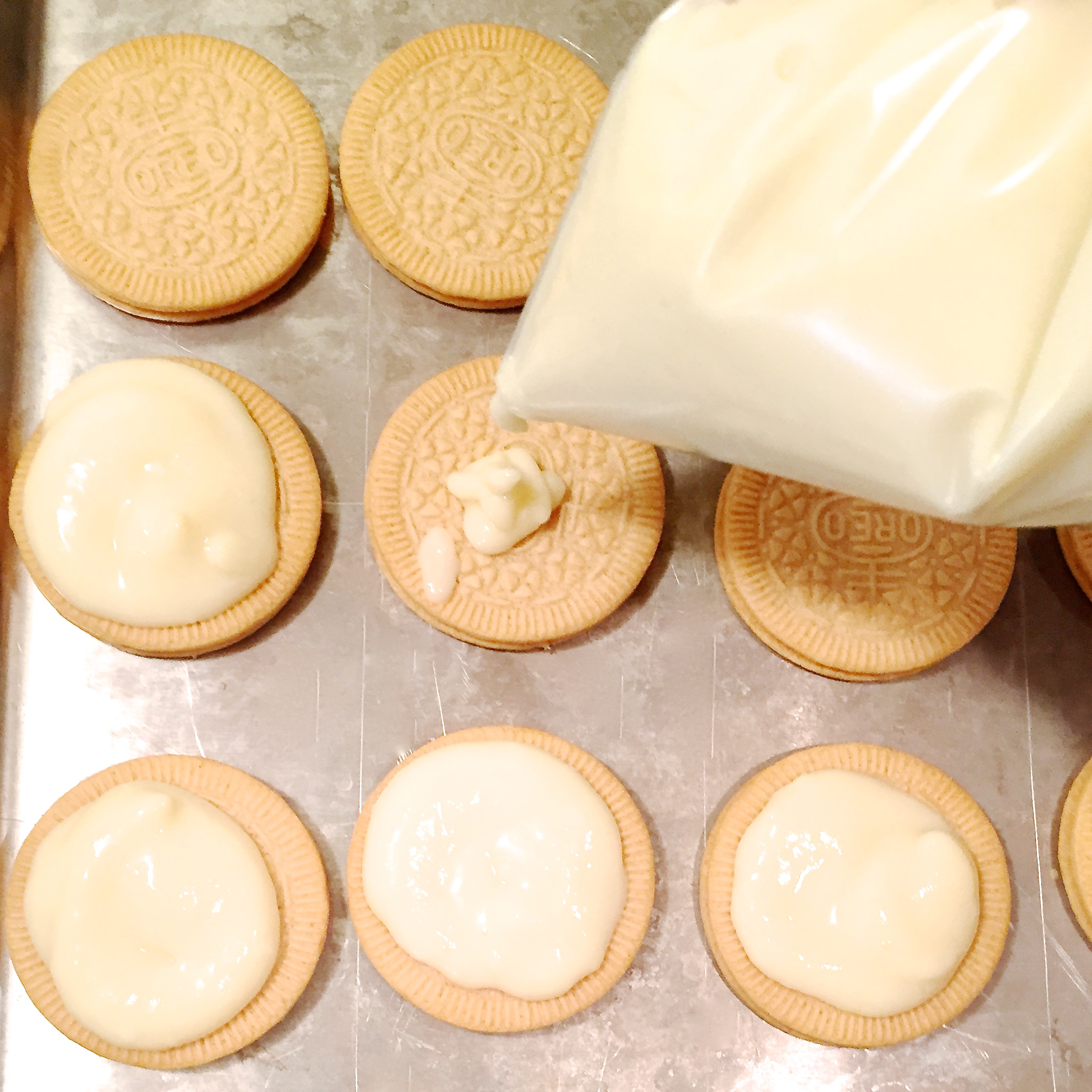 - Do this for all the Oreos, and set them on a large plate or cookie sheet to FREEZE for about 10 minutes.
