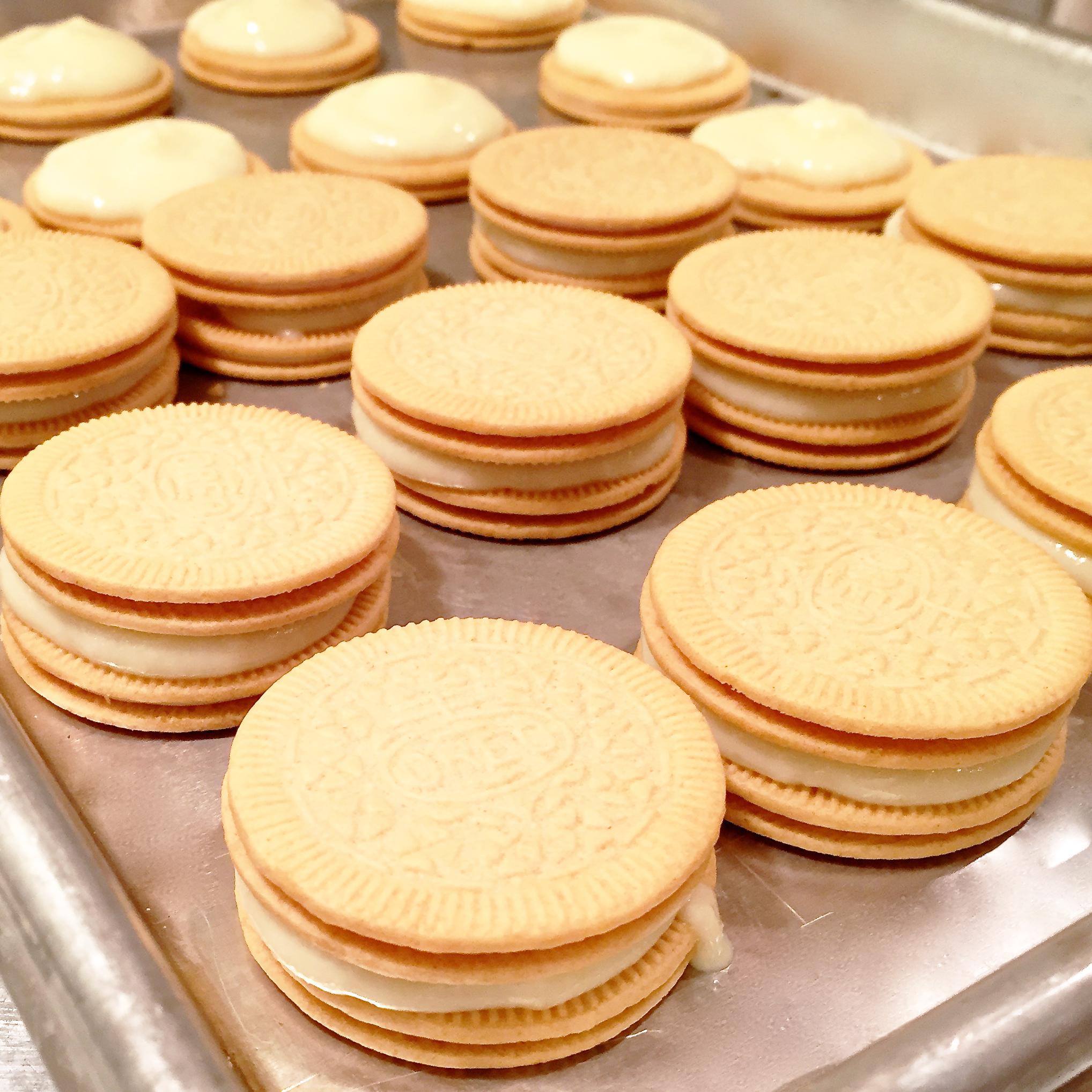 - Place the top of the Oreo back on so that the stick is in the middle with the filling.