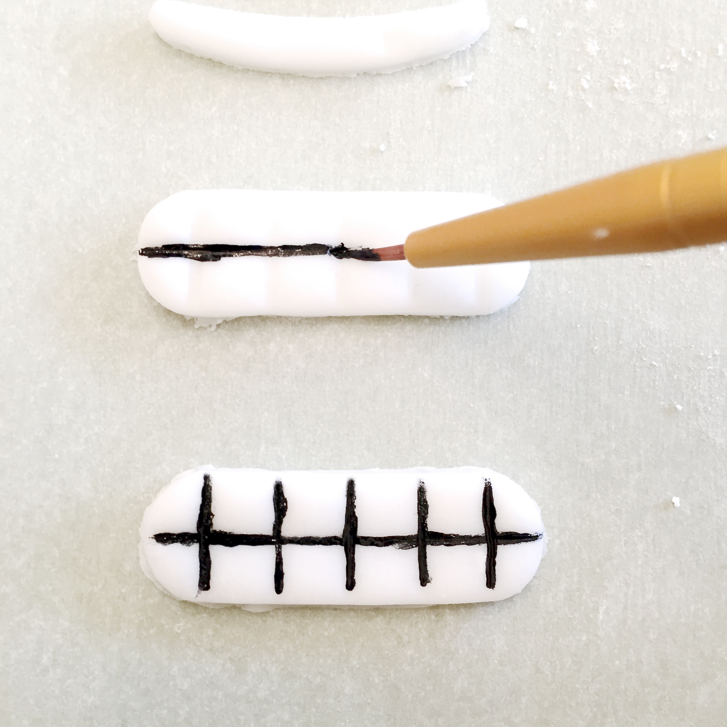 - Using a small rolling pin and a little powdered sugar, roll the fondant out like cookie dough and cut all the white pieces of the faces you want to make. The big eyes and teeth are easy- but the little teeth need a toothpick’s help to poke them out of the cutter when it picks them up off the table. You will also want to “paint” the black lines on the big teeth with black gel food coloring. You can use a toothpick or a small brush to do this.