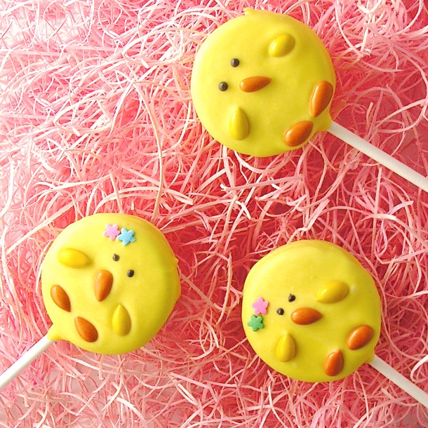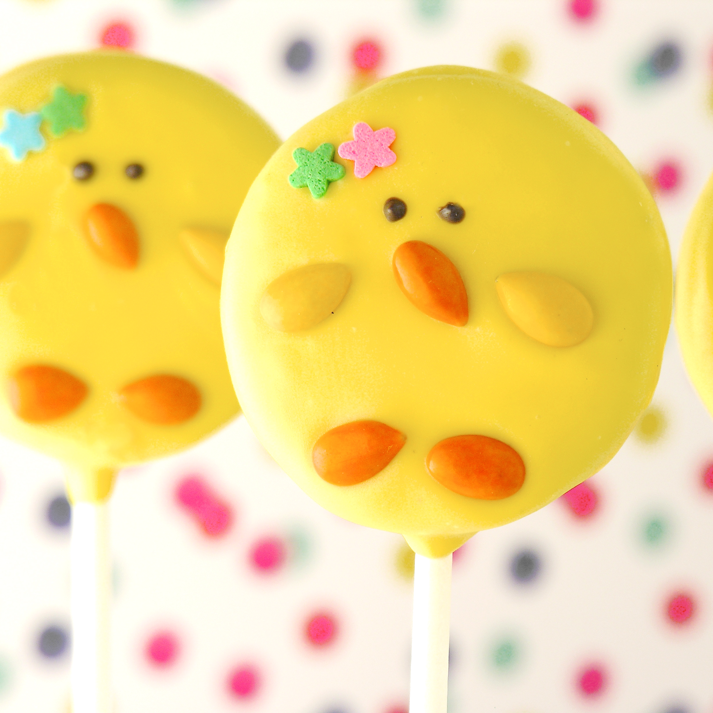 - Hold a chilled pop by the stick, and spoon yellow candy melts over the top, bottom and sides of the Oreo.