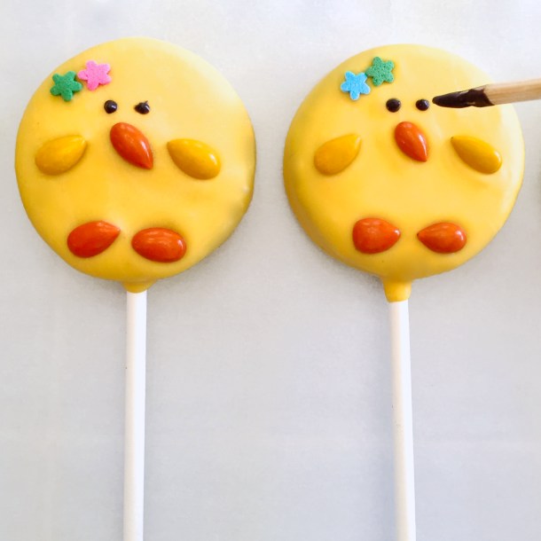 - Dip the end of a lollipop stick into the melts, spread a little on the top of the white filling of the Oreo and then press the stick into the white filling.