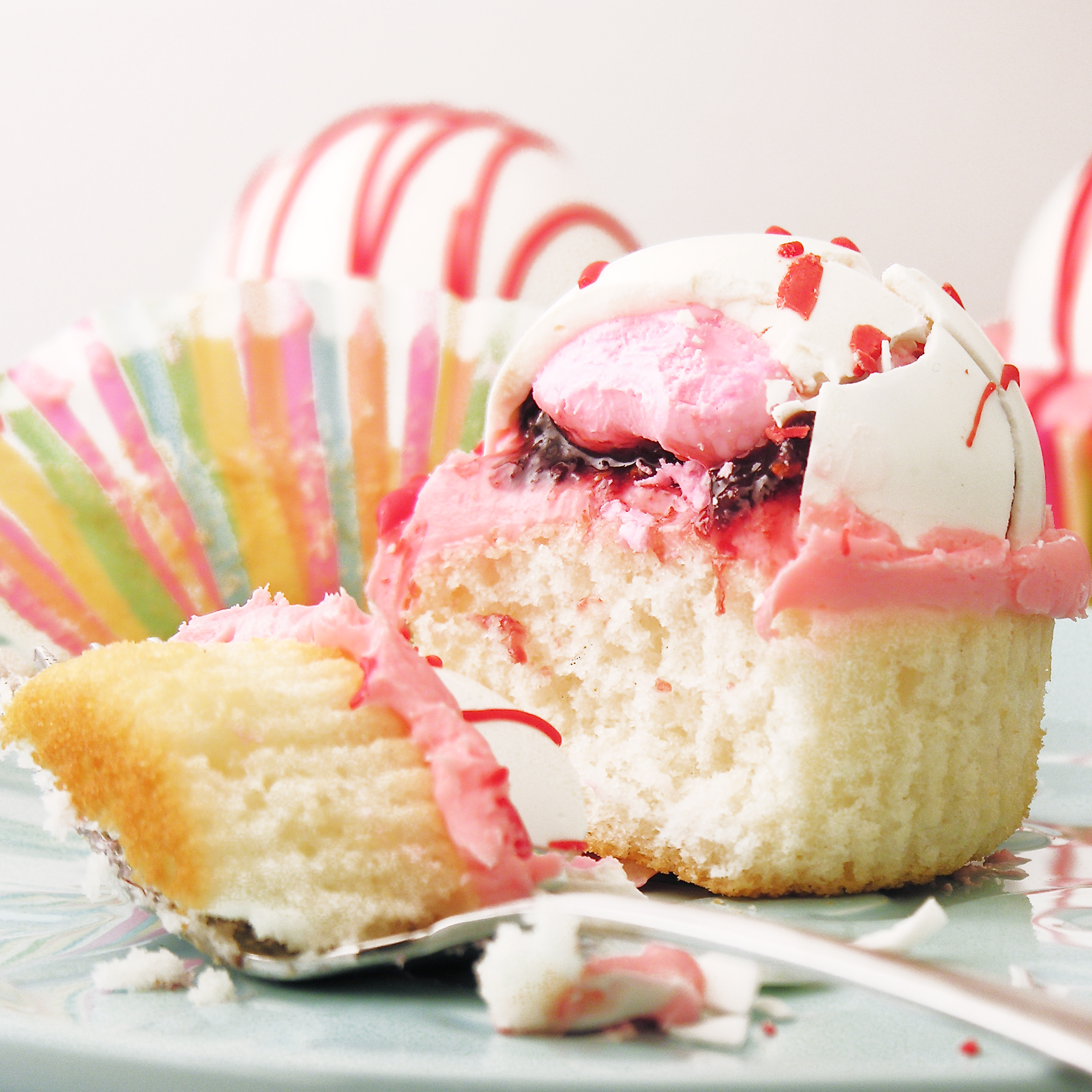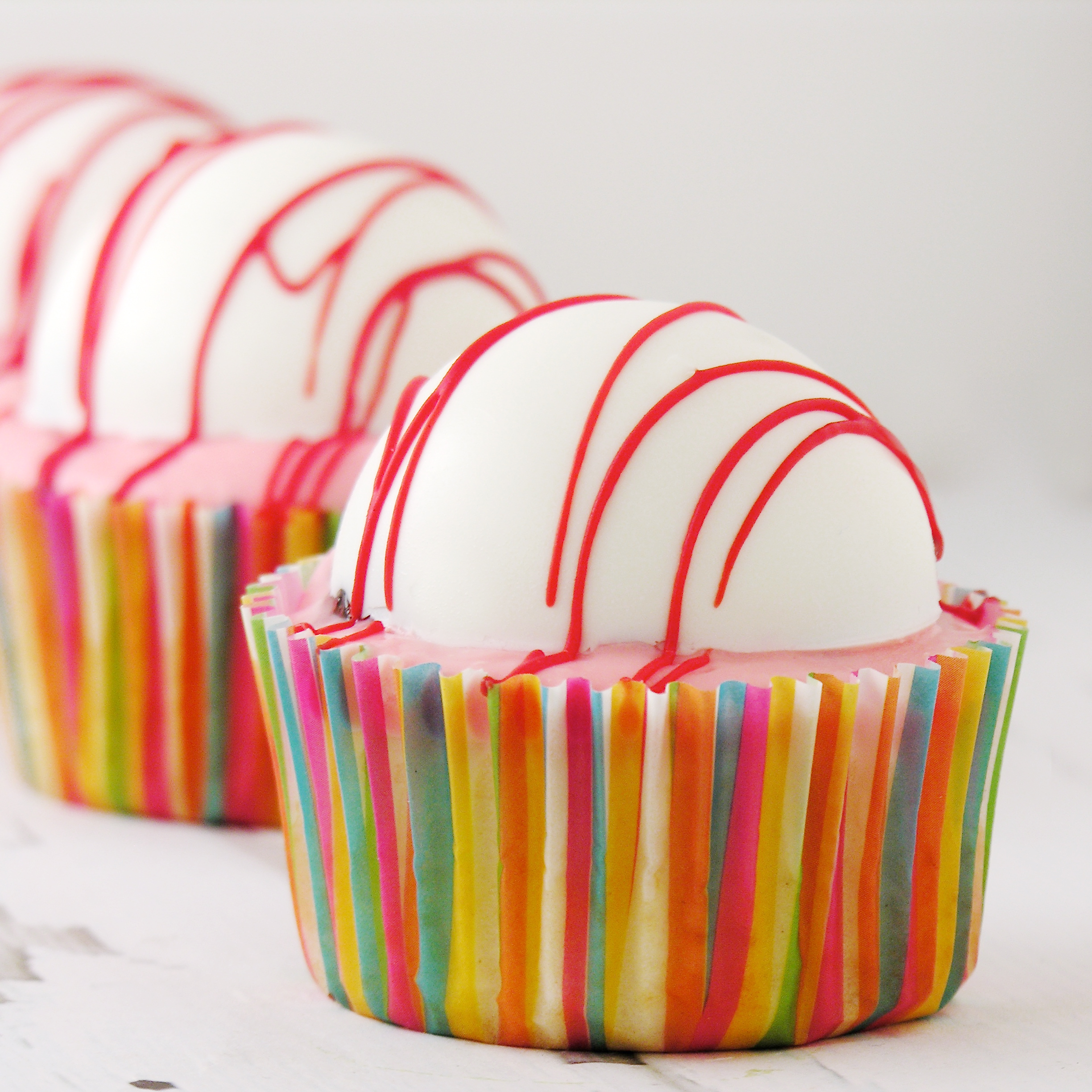 These are incredibly delicious and fun to make. They use a fun (and inexpensive) silicone mold that I got here and have used before on my Peanut Butter Bomb Brownies. I just love how beautiful the dome of white chocolate looks atop these cupcakes! There are so many possibilities for fillings….!