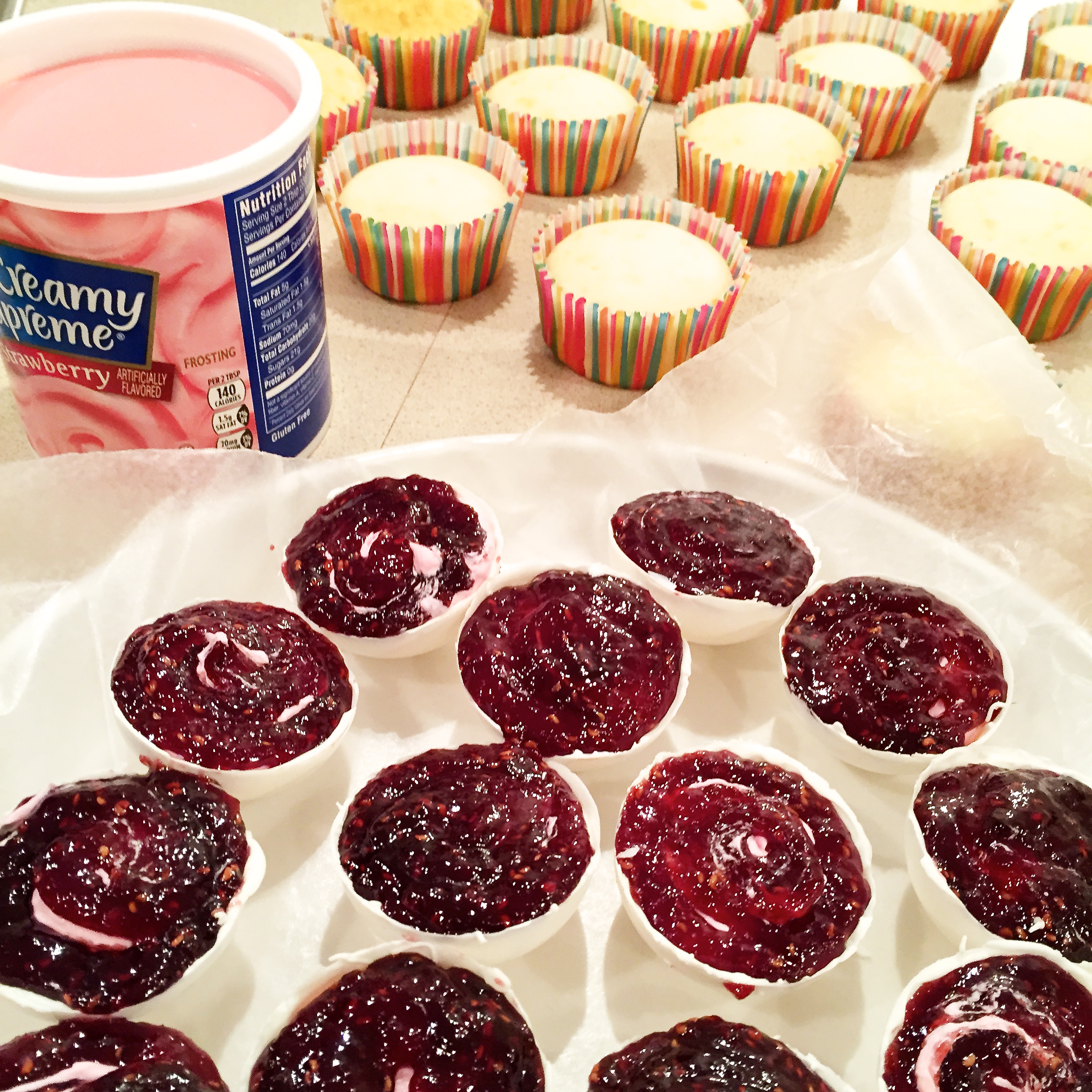 - Place filling into a large zip-top bag and clip a corner. Pipe filling into hardened cups- about 3/4 full- and then top with a little jam.