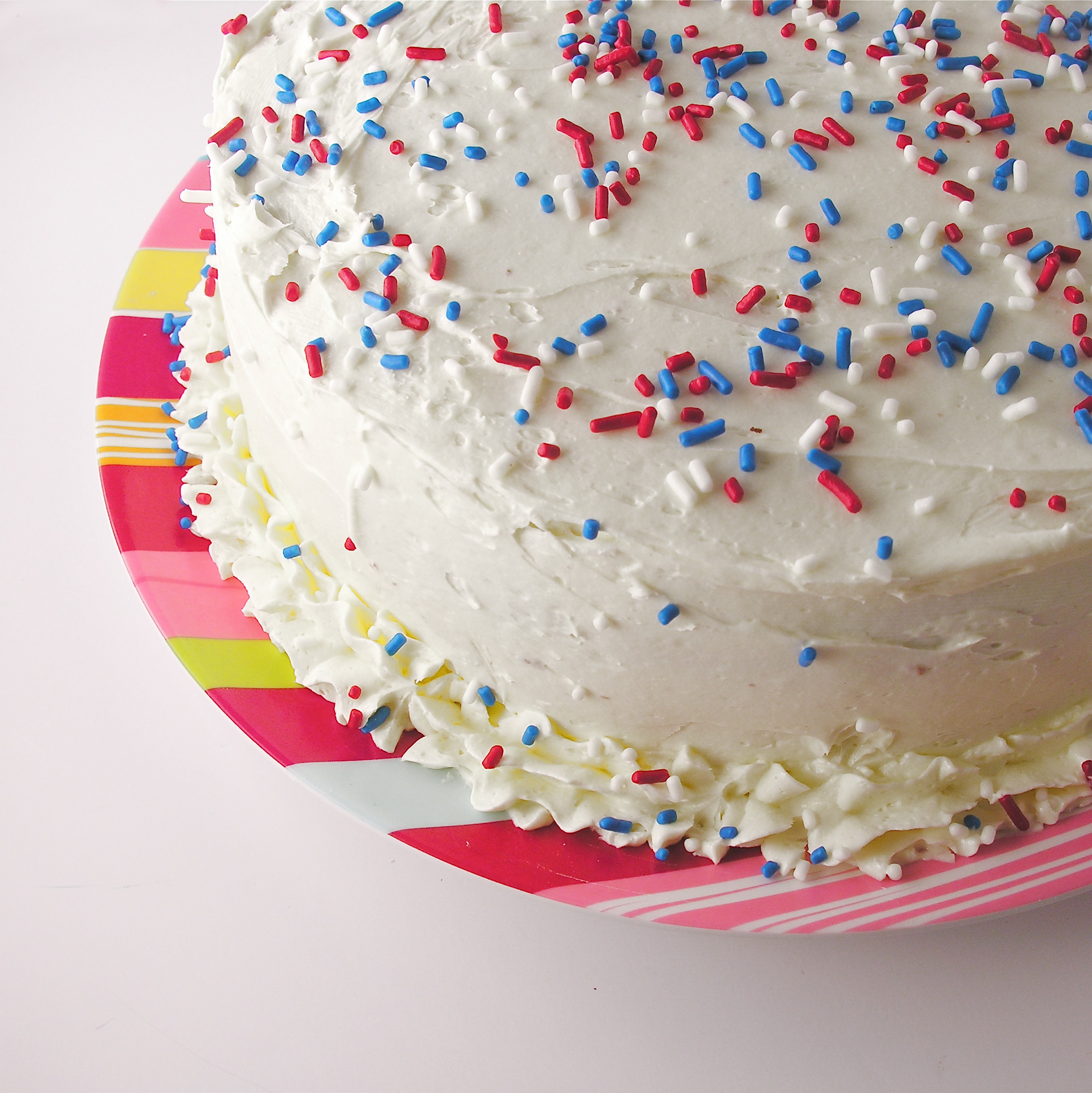 - Frost the entire cake in purple and then, using a round (2A) Wilton tip, pipe round dots all over the top of the cake in the 3 colors.