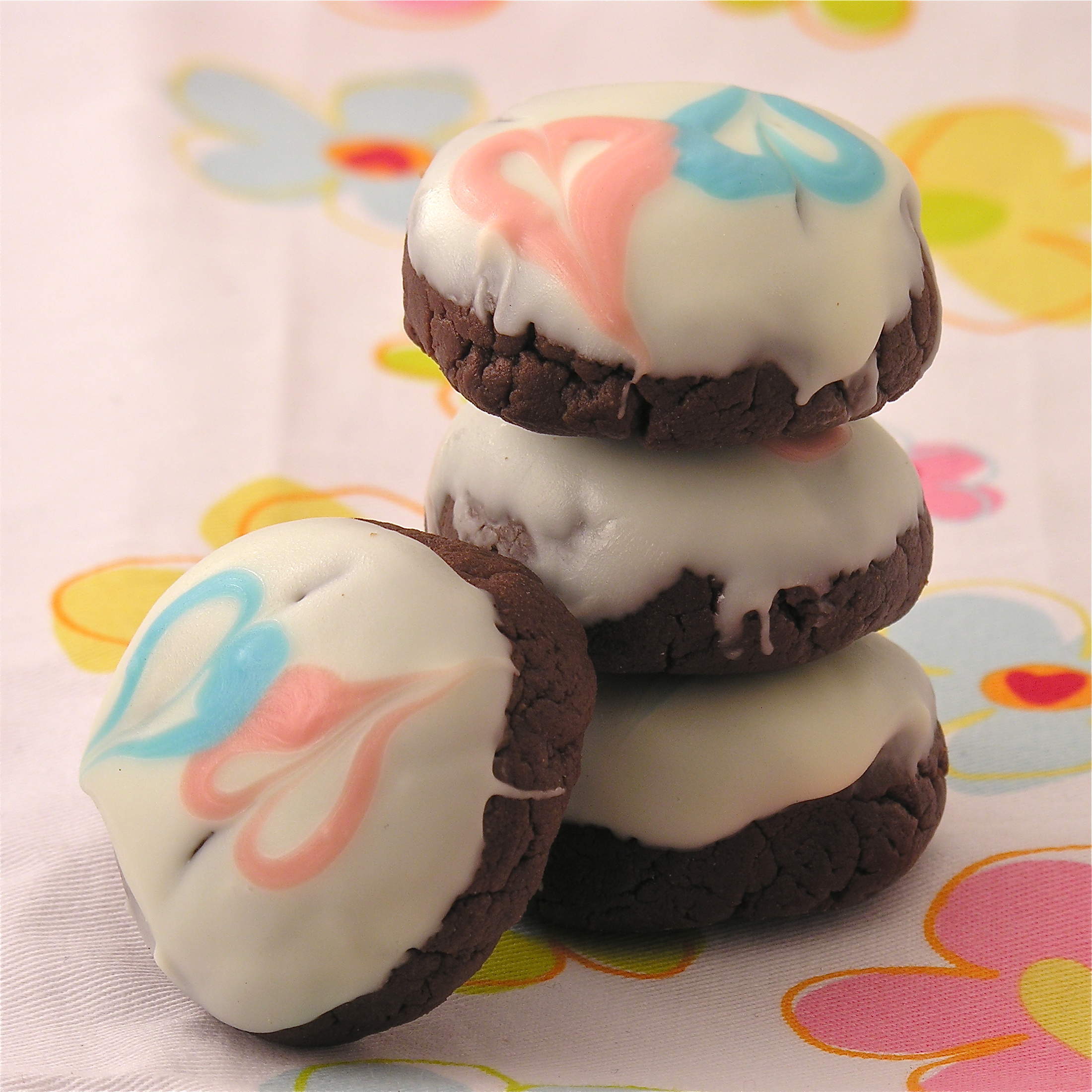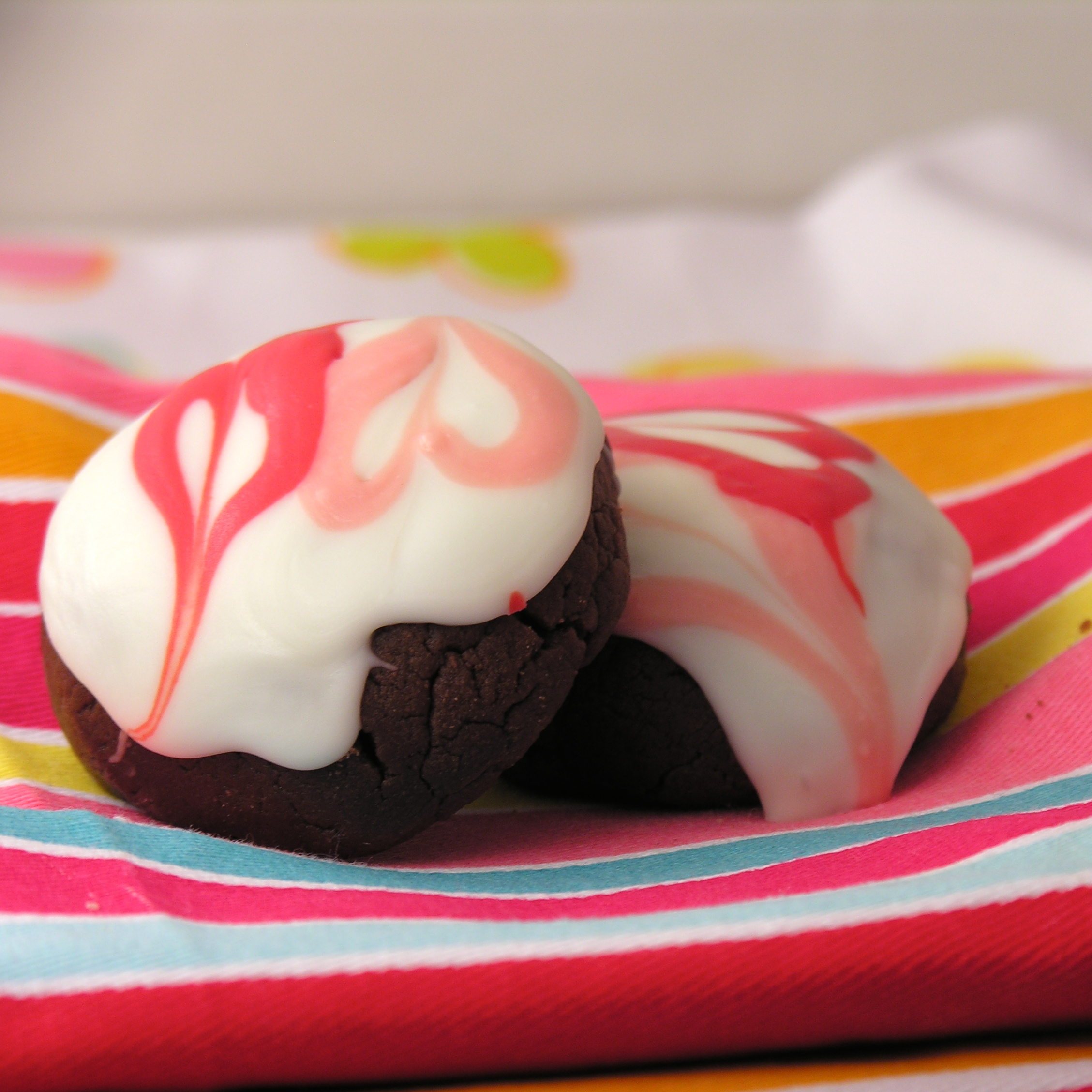 - To make coffee or heart design, pipe lines on top of cookie with white chocolate, and pull a toothpick through to form design. Otherwise (much easier!) sprinkle with some crushed peppermint or heart sprinkles!